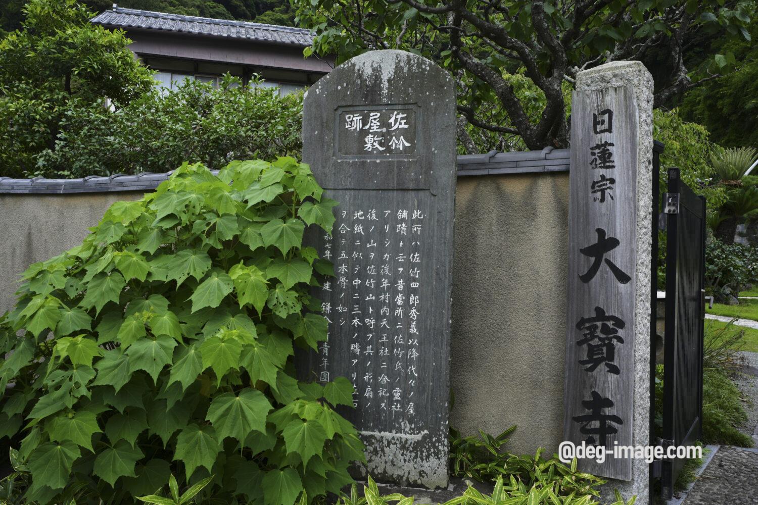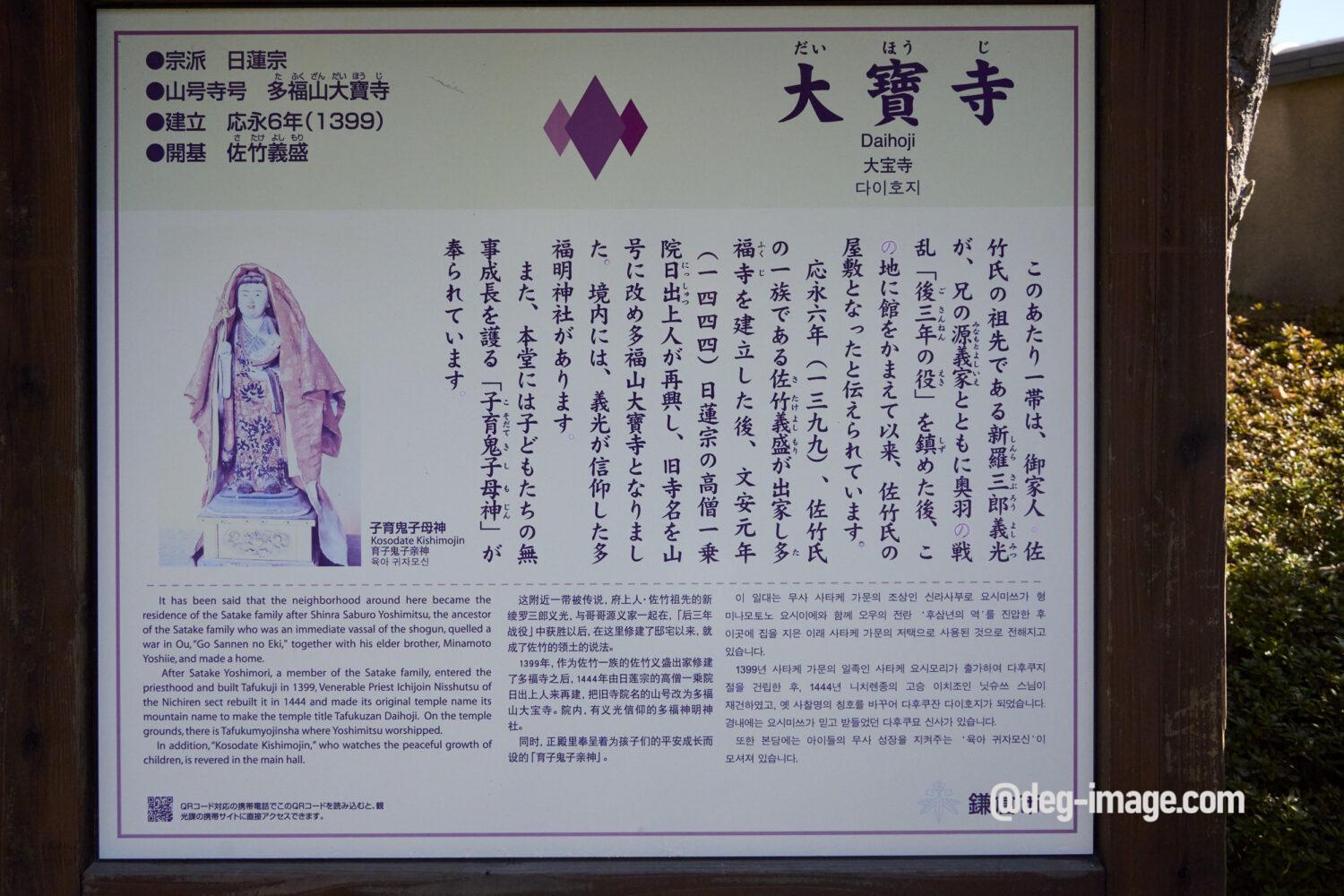 大宝寺は、後三年の役の後、源義家の弟新羅三郎義光が、この場所に館を構えたのが始まりで、室町時代に義光の子孫である佐竹義盛がこの地に住んだので佐竹屋敷とも呼ばれました。佐竹義盛は館内に多福寺を建立しますが、戦国時代に荒廃し廃寺となります。その後跡地に日出上人が日蓮宗の寺を再興、多福寺の名を山号に残し、多福山大宝寺としました。