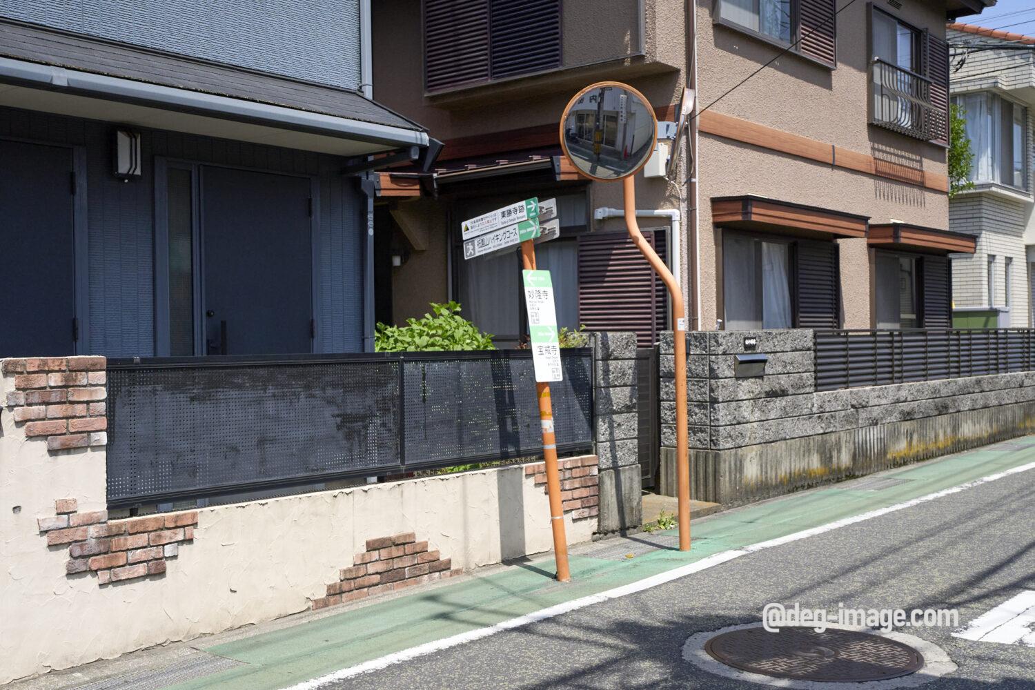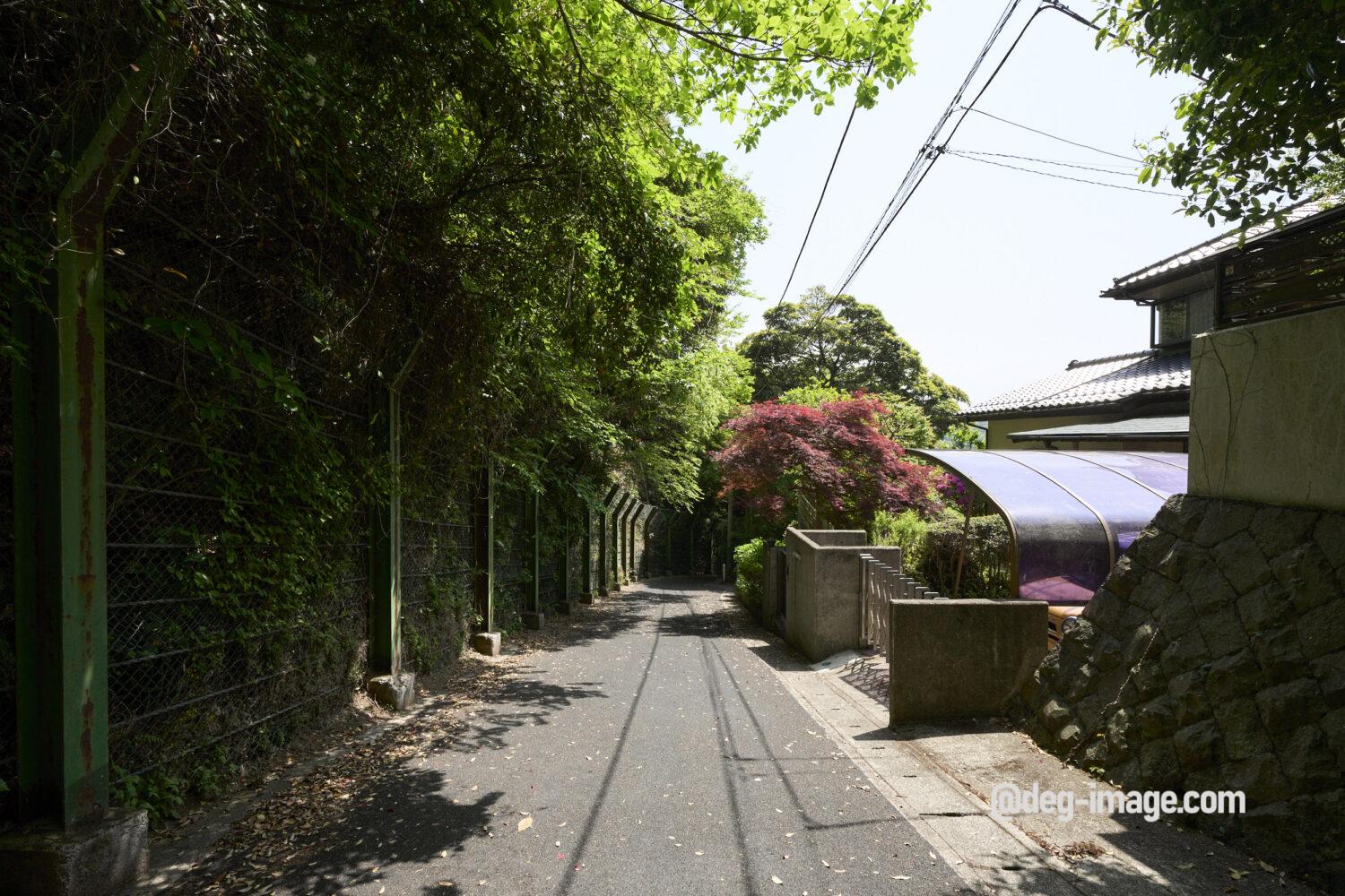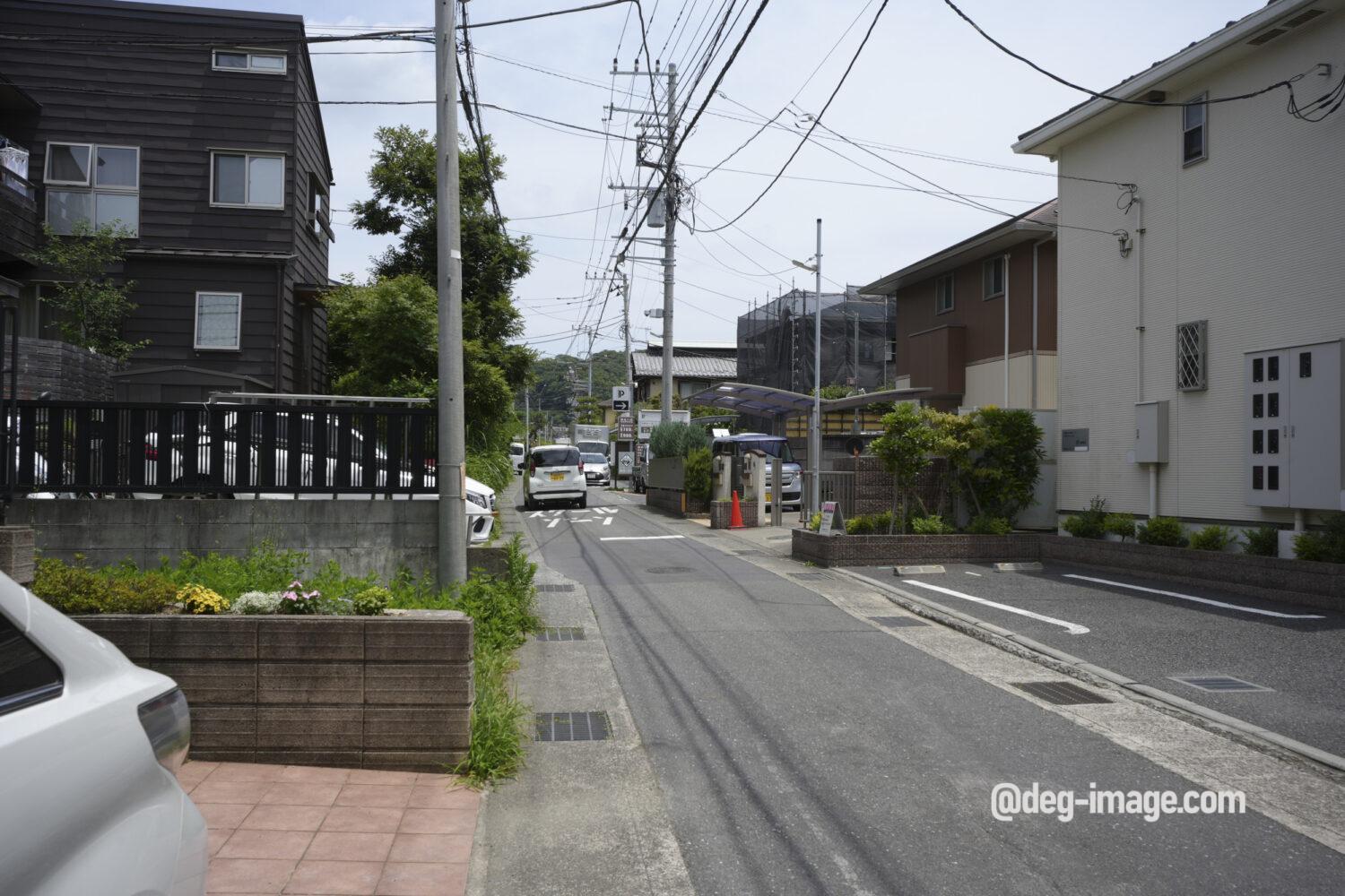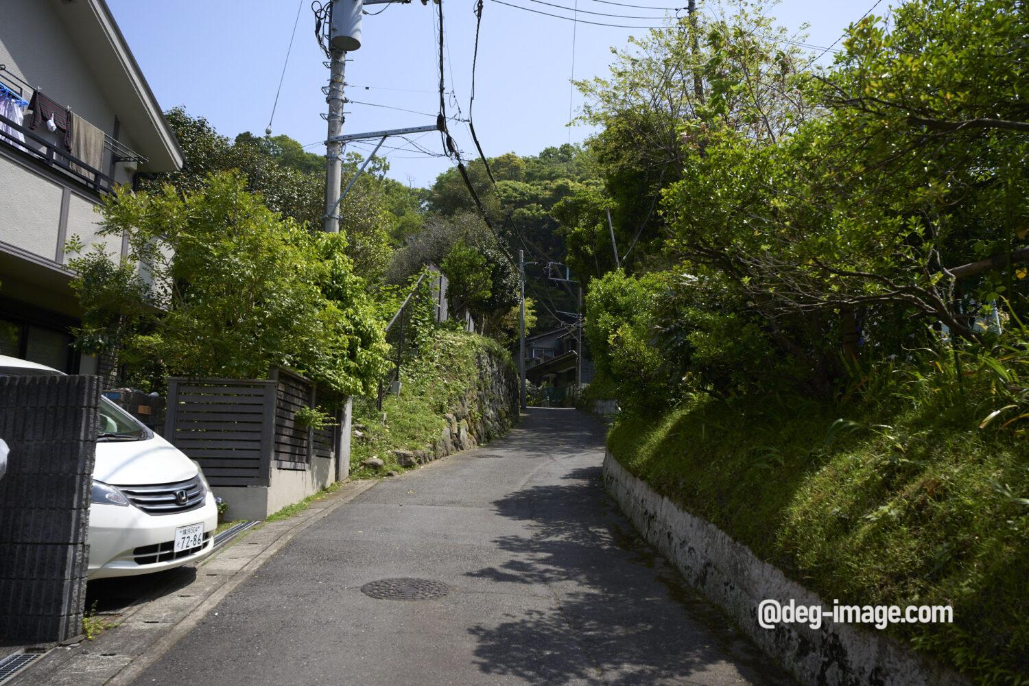 腹切りやぐらから先程来た道を戻る形で路地を下ります。100mほど下ると右側にカーブミラーのあるT字路に出るので左に曲がります。