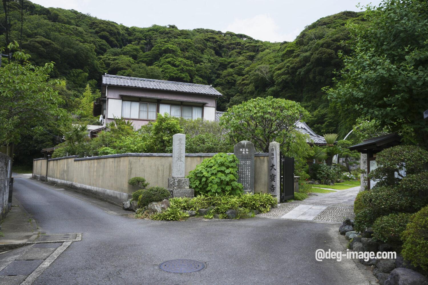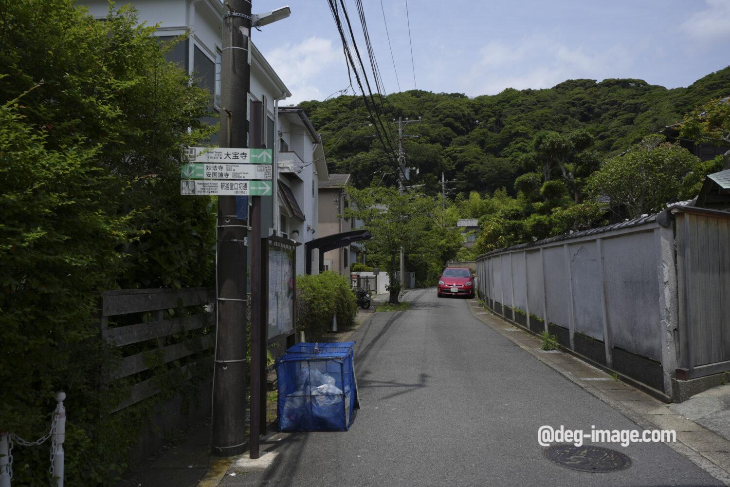 宝戒寺隧道を出て住宅街を道なりに進み、突き当りを左に曲がると大町大路に向かう道となります。この道を暫く進むと右に大宝寺の案内があります。そこを右に曲がると大宝寺です。