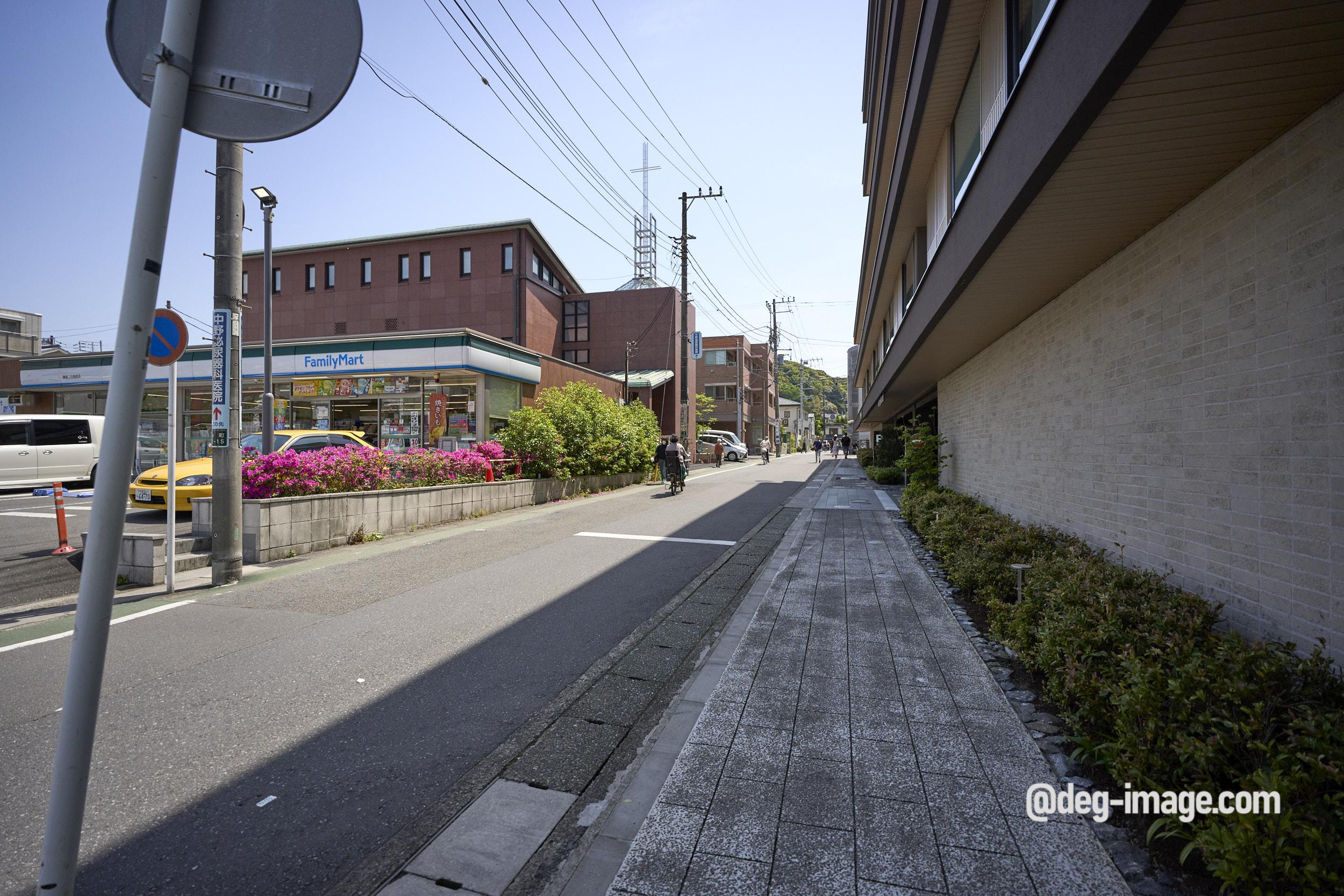 ファミリーマート横の道を進んだ突き当りが小町大路で、その小町大路を渡ったところに蛭子神社があります。蛭子神社の小町大路に面した入口は狭く、鳥居も少し奥まっているので、そこに蛭子神社があると知っていなければ見落としてしまうかもしれません。