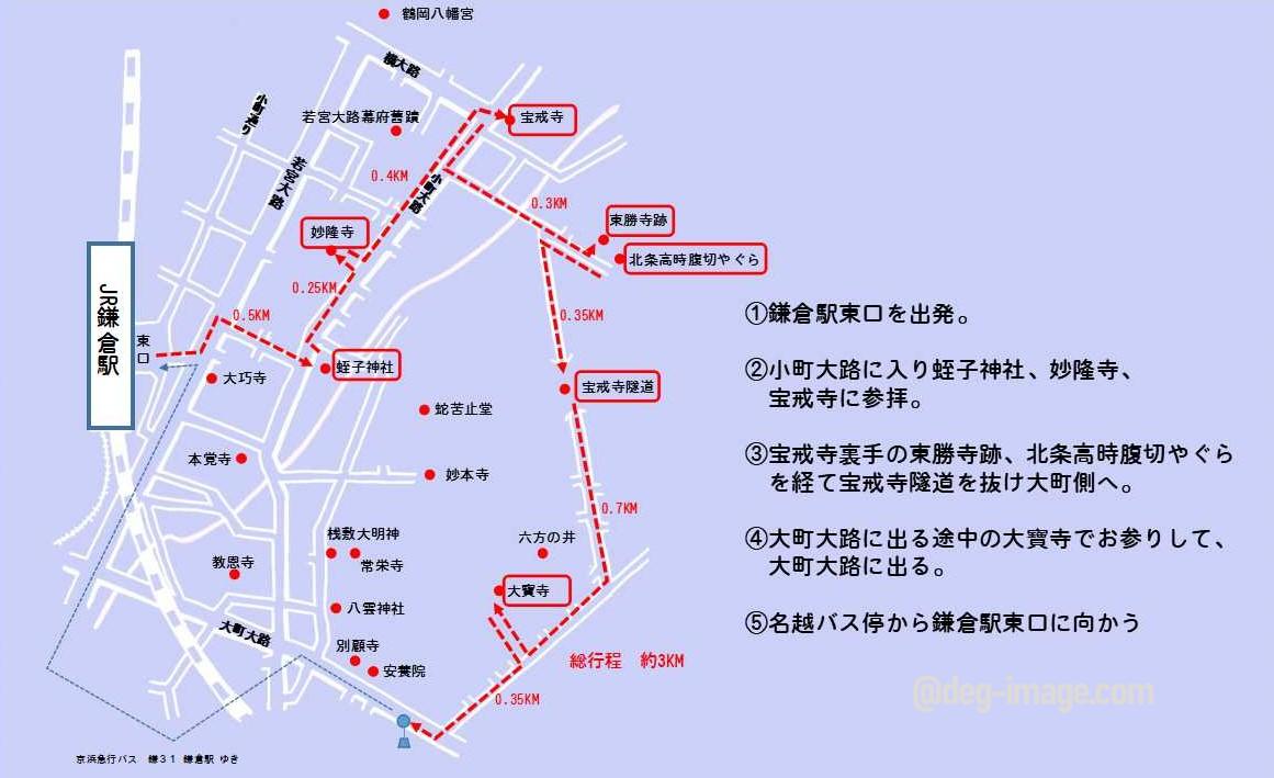 全体的な行程は、徒歩でJR鎌倉駅を出発し、小町大路にはいり小町エリアの北側、妙隆寺や宝戒寺を参拝、