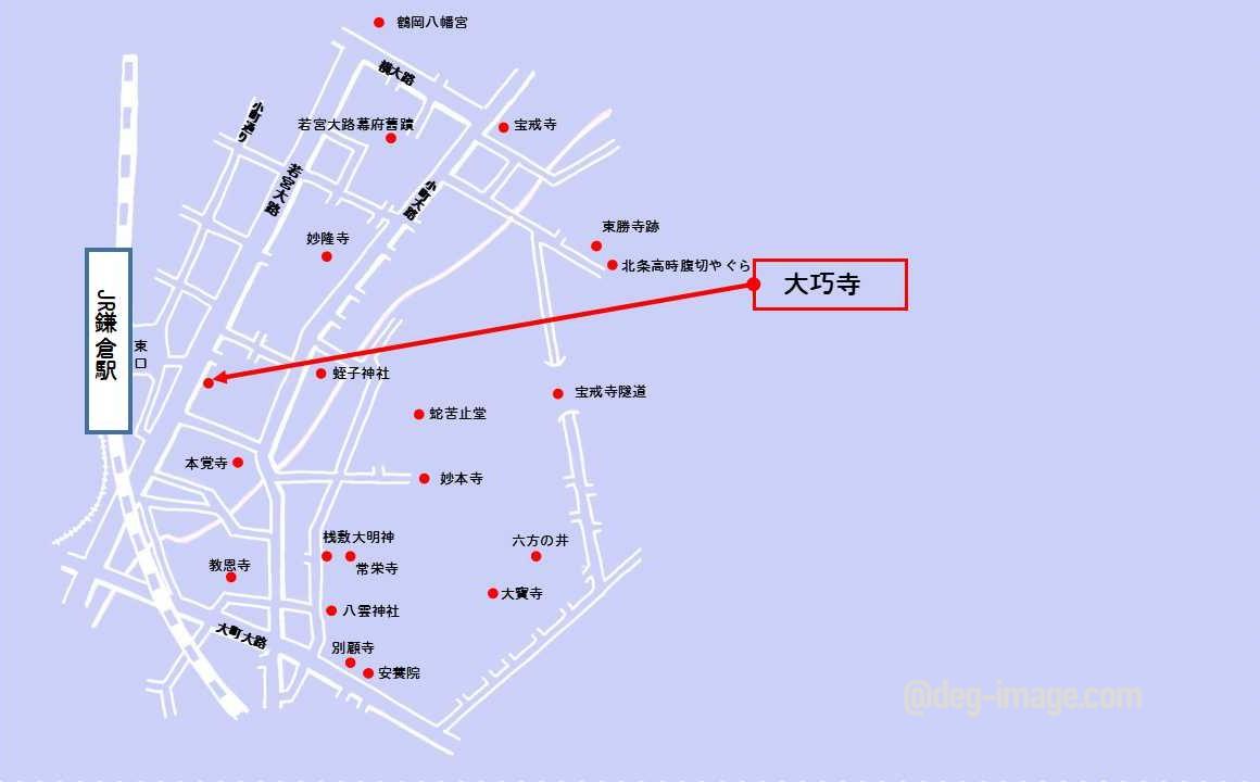 JR鎌倉駅東口から東方向にある若宮大路の鎌倉駅入口交差点の東側、島森書店ときらら鎌倉の間に大きな赤い車止めの石が建っている寺院が大巧寺です。大きな鎌倉案内図の横にりっぱな松の木があり、その奥に生い茂る緑が目印になります。