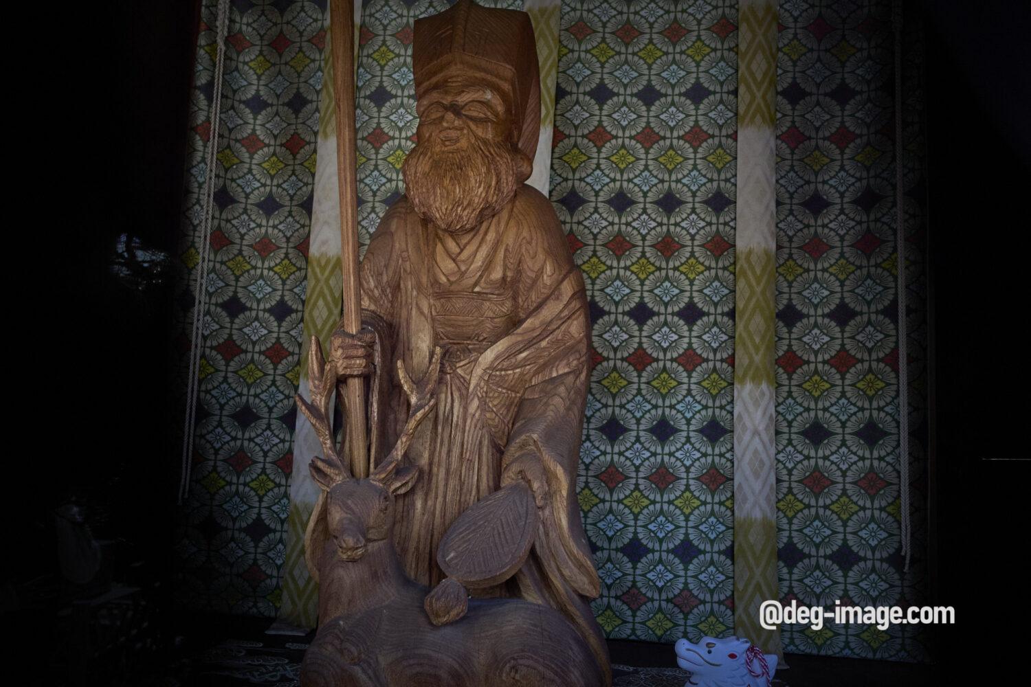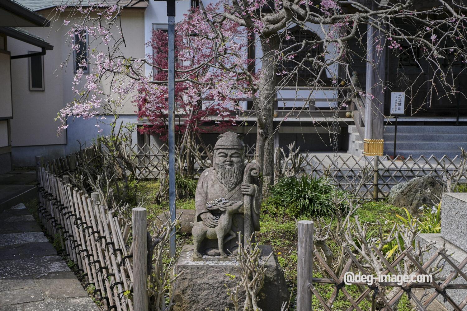 妙隆寺の長寿の神寿老人(じゅろうじん)様は鎌倉江ノ島七福神のひとりです。中国宋代の人であり長寿の神様で、けやき一本造りの寿老人像が祀られる祠が本堂右手にあります。また、本堂前の寺標のそばにも石像があります。