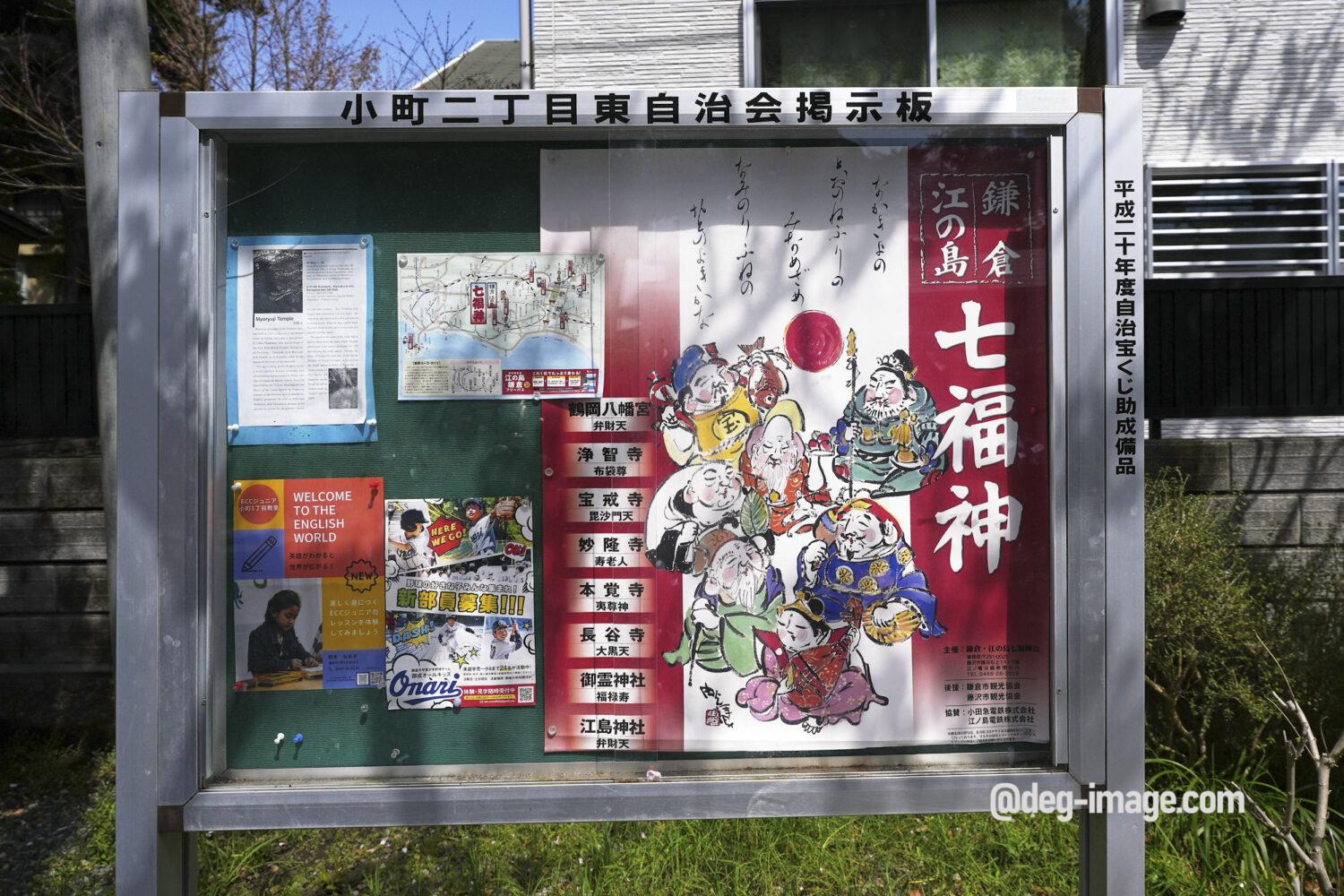 札所は浄智寺(布袋尊)、鶴岡八幡宮(弁財天)、宝戒寺(毘沙門天)、妙隆寺(養老人)、本覚寺 (恵比寿 戎神)、長谷寺(大黒天)、御霊神社(福禄寿)、江島神社(弁財天)となっています。