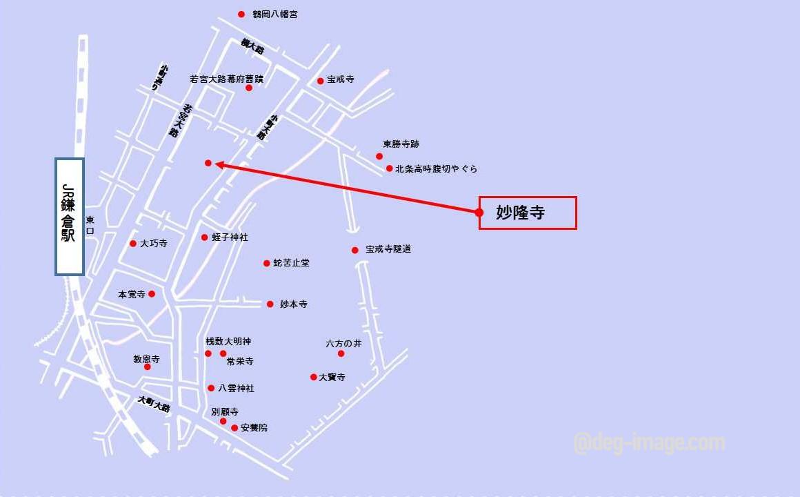 鎌倉駅東口から若宮大路を鶴岡八幡宮方向に進み、二の鳥居前交差点を右に曲がって進むと小町大路に出ます。小町大路を左に北方向に200メートルほど進むと左手に妙隆寺があります。