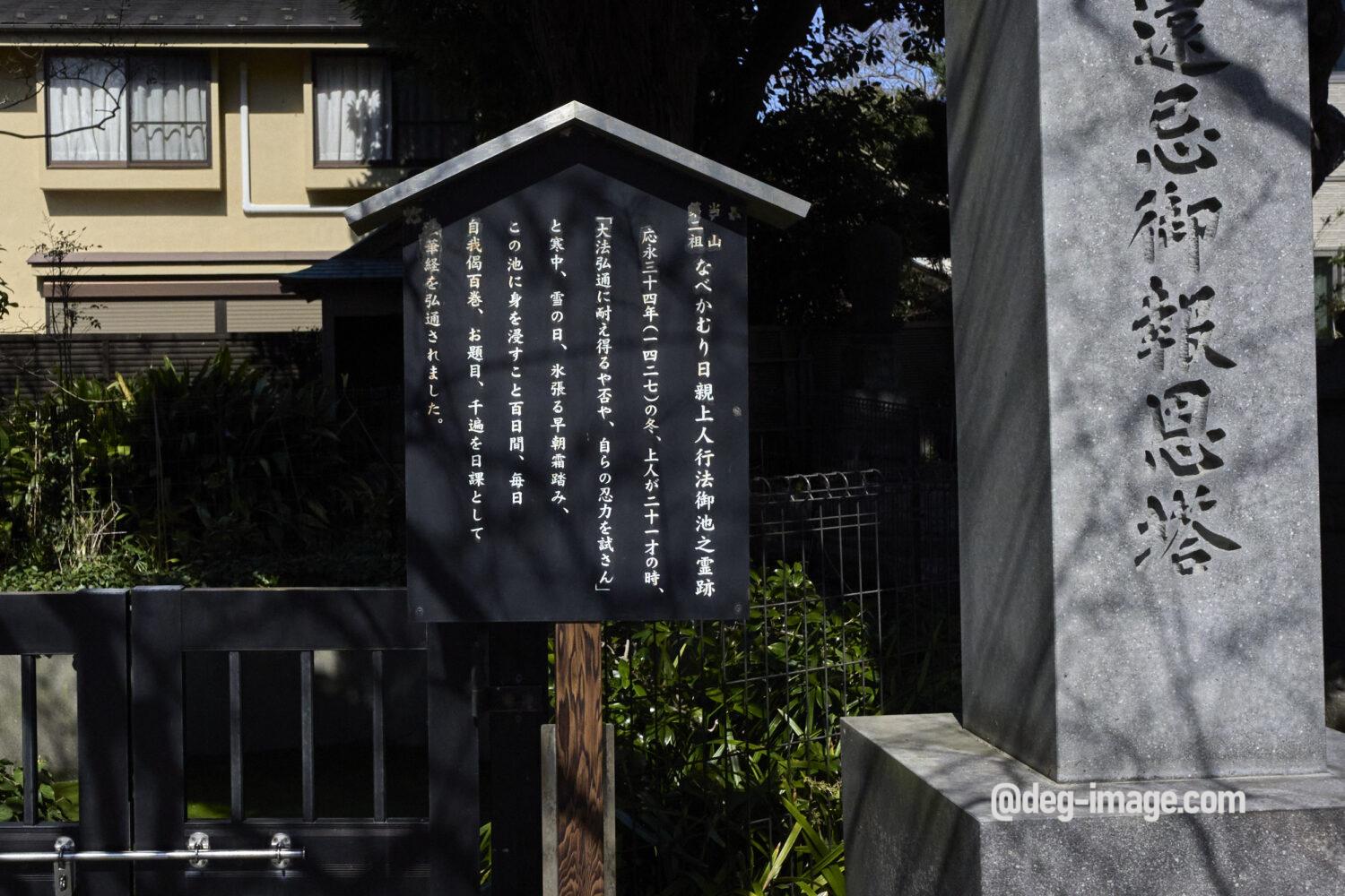 本堂右手の池は、日親上人が21歳のときに寒中、百日間水行をした池とされ、厳しい修行の跡と言われています。
