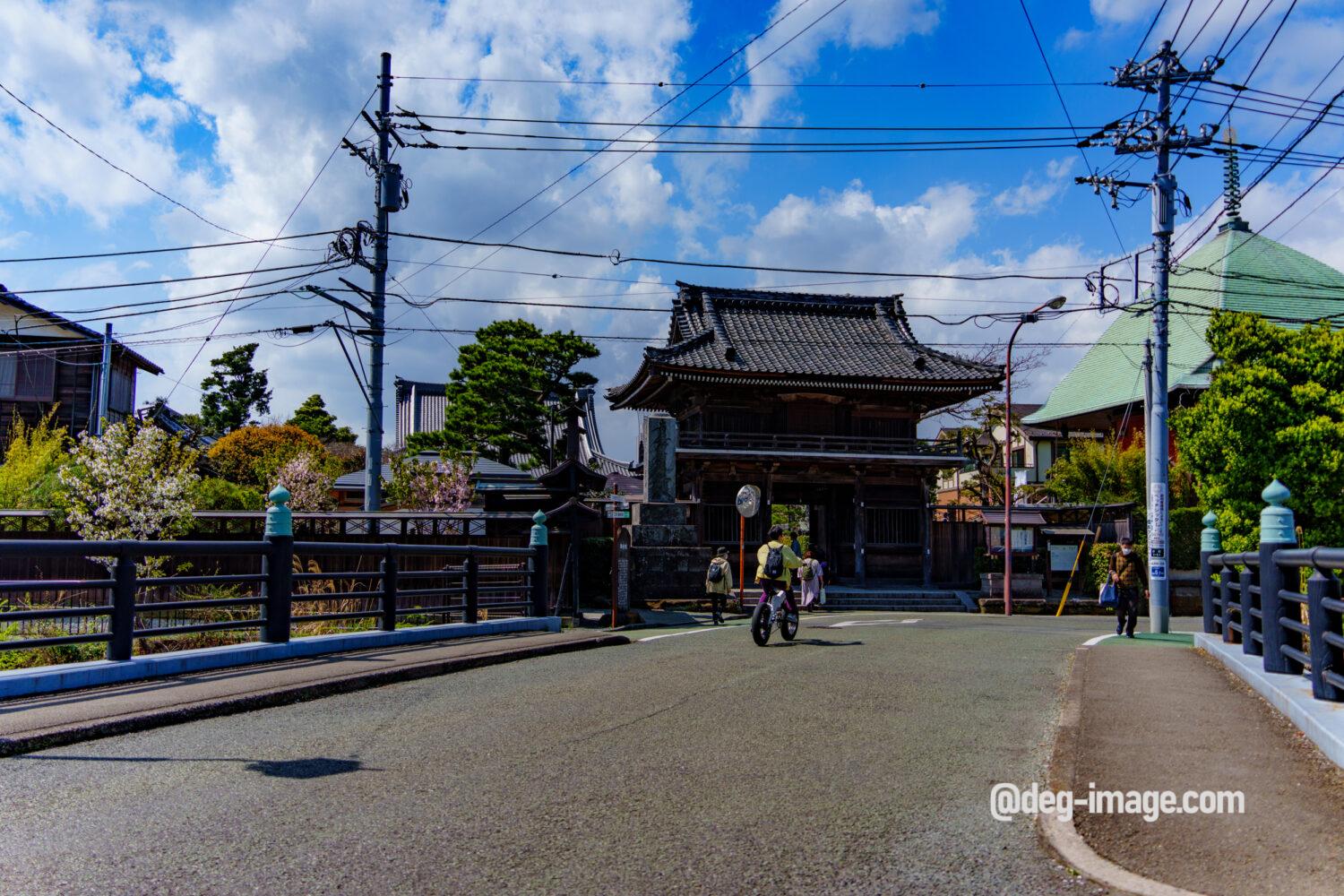 仁王門の前の滑川には夷堂橋(えびすどうばし)がかかっています。鎌倉時代初期にこの場所に夷堂が建てられ、一度は消失しますが、本覚寺建立の際、本覚寺内に再建されます。