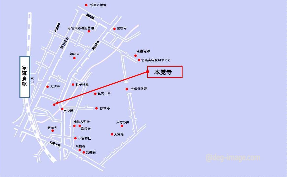 鎌倉駅東口から若宮大路を渡り、右方向(海側)に進み、鎌倉郵便局の先を左に曲がると右手に本覚寺境内の入口が見えます。