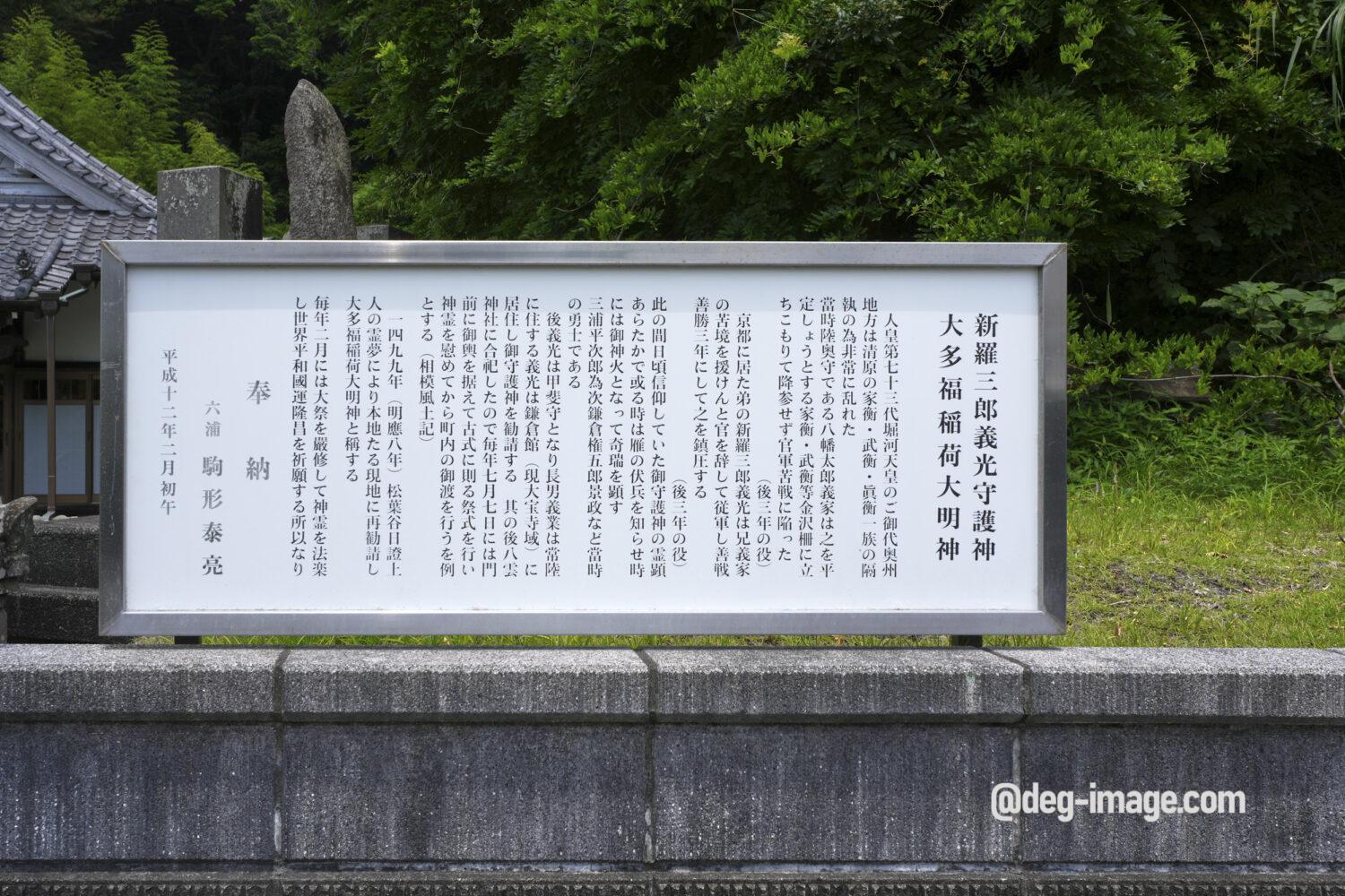 境内には新羅三郎源義光ゆかりで佐竹氏の守護神社の多福明神社(大多福稲荷大明神)、裏山には義光の墓と伝わる宝篋印塔があります。