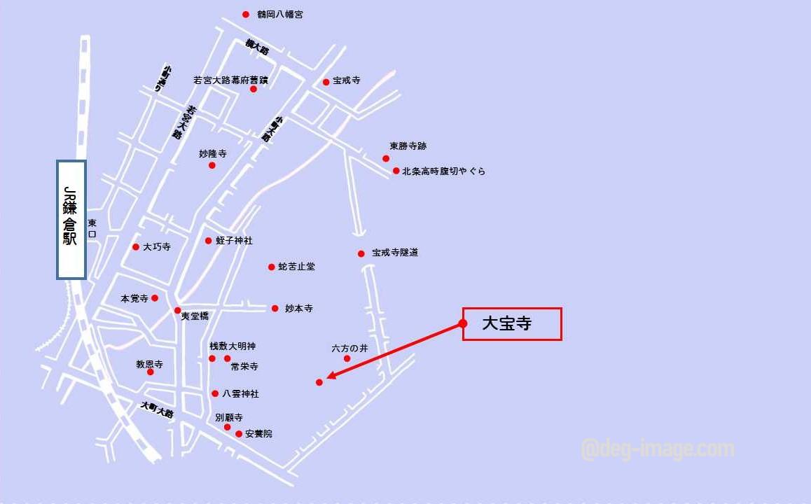 鎌倉駅東口から大町大路の回生堂前の交差点までは徒歩で20分ほどです。駅から若宮大路ー大町大路と進む道、若宮大路を横切って小町大路ー大町大路と進む道があります。鎌倉駅東口から大町大路までは別願寺のページを御覧ください。交差点までは別願寺から安養院を経て200mほどの距離です。