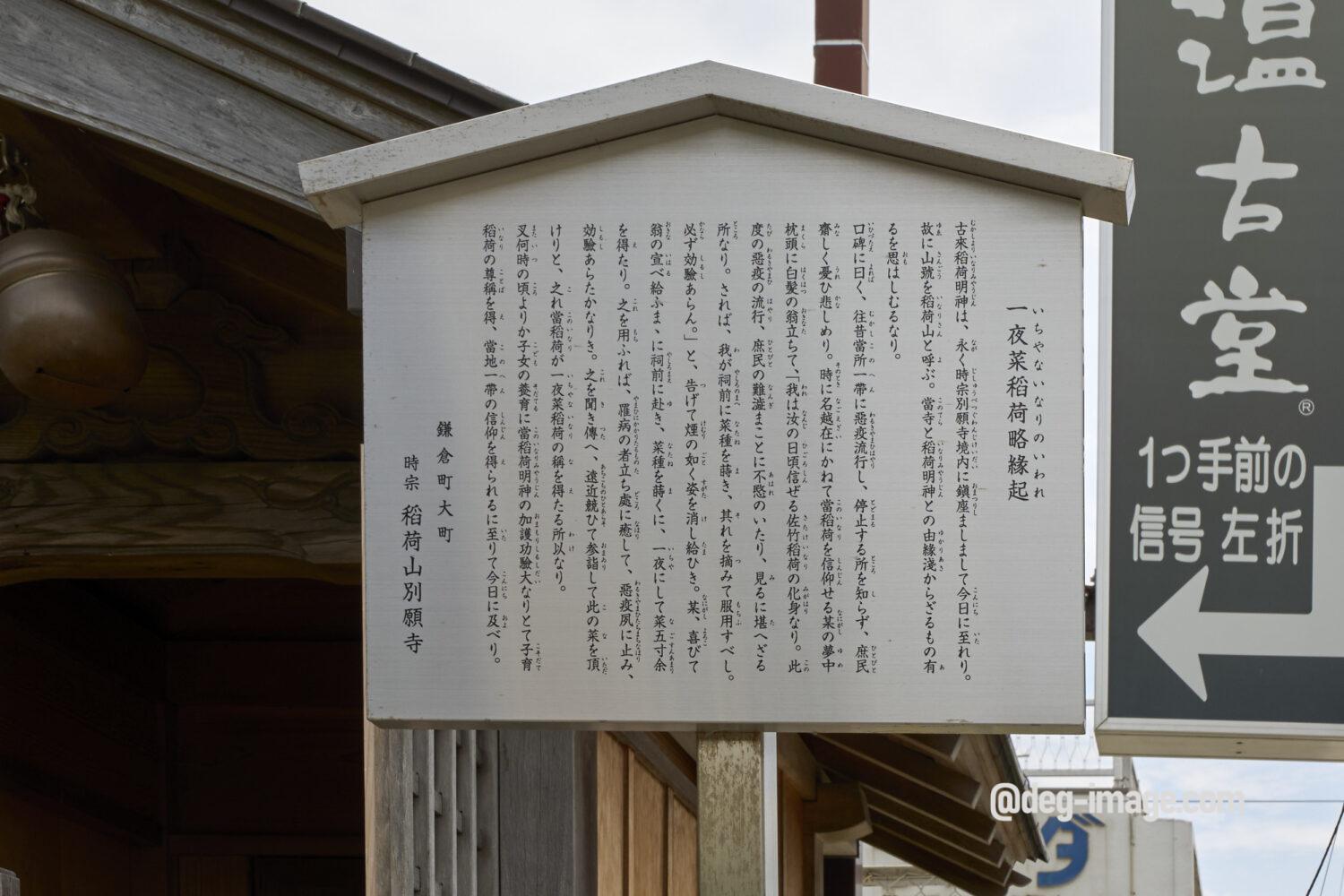 一夜菜稲荷明神の由緒は別願寺による案内板が立っています。