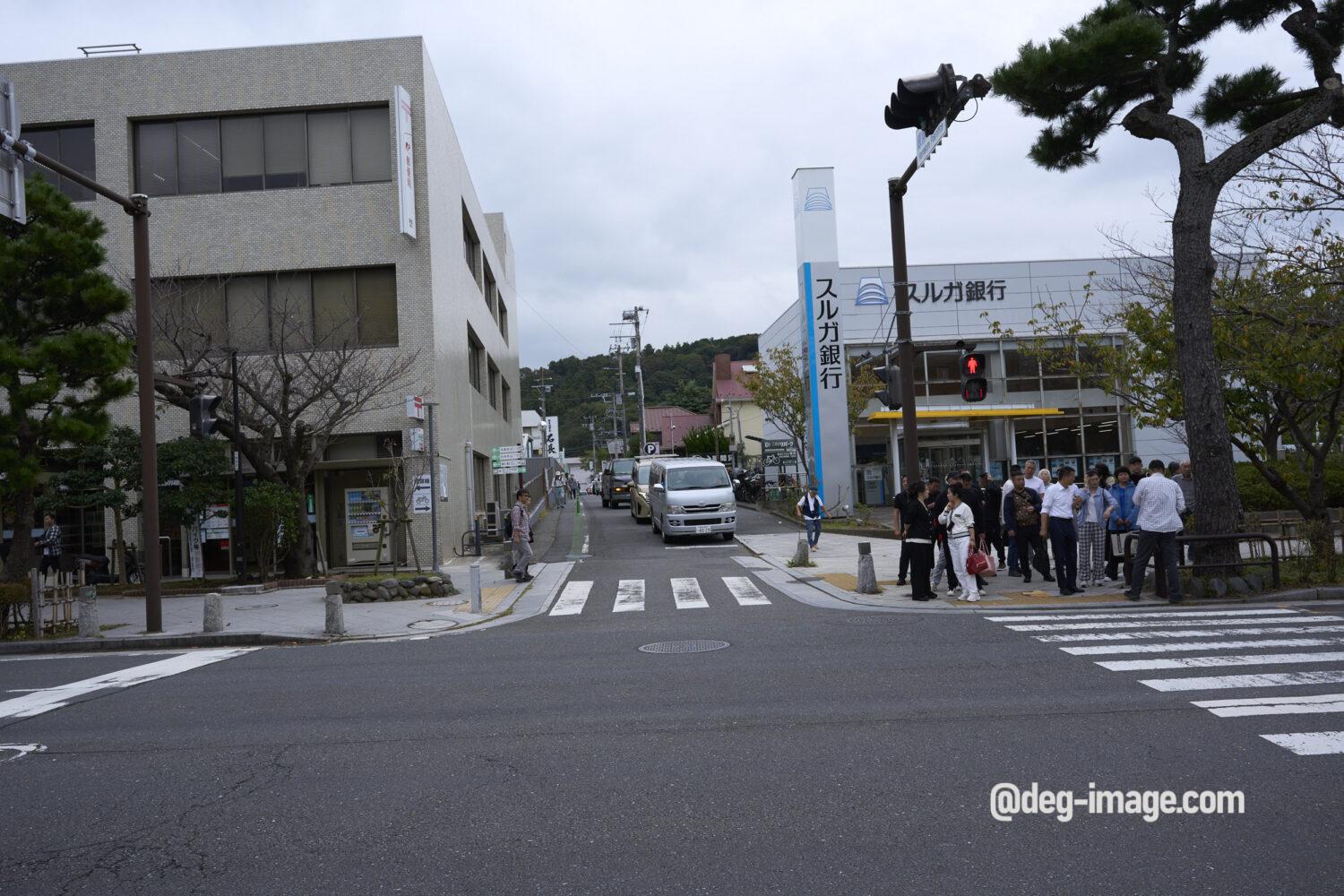 路地の先は若宮大路の交差点になっていますので、歩行者信号を渡りスルガ銀行の前を右に若宮大路を南下します。
