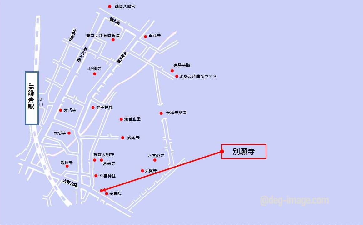 鎌倉駅から別願寺までは、若宮大路を南下しJR線横須賀線と交差するところから大町大路を東に進む道と、小町大路を南下し大町大路との交差点から大町大路を東に進む二つの道があります。