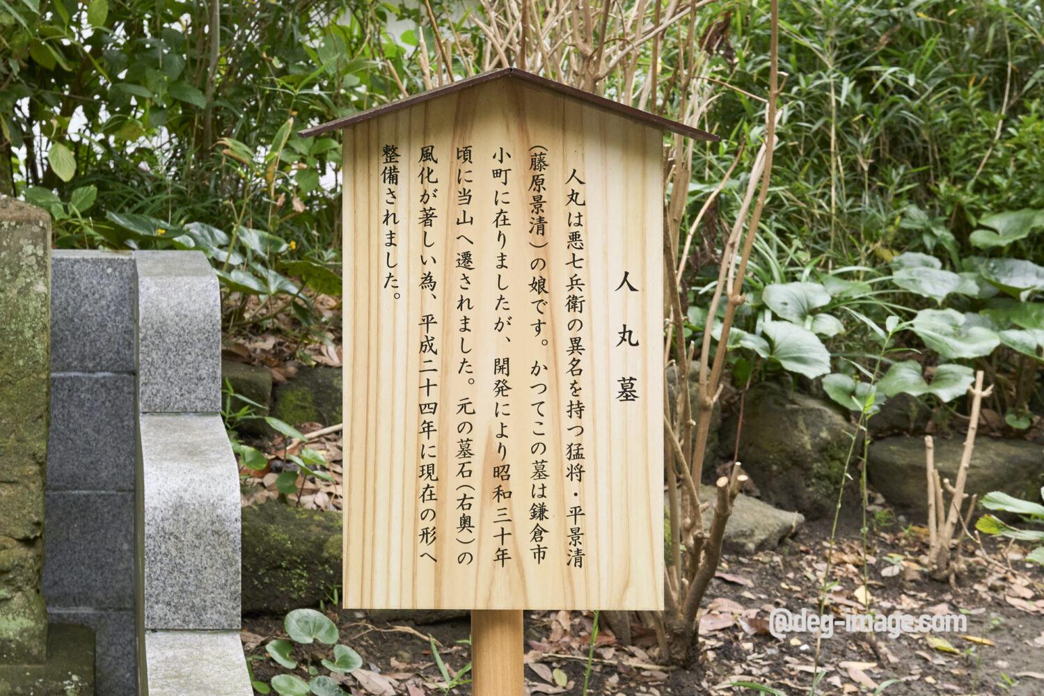 人丸(姫)は景清の娘で、景清の死後出家し亡くなります。その墓がかつて鎌倉の小町にありましたが、宅地開発により安養院に移設され、新たな供養塔とともに整備されています。