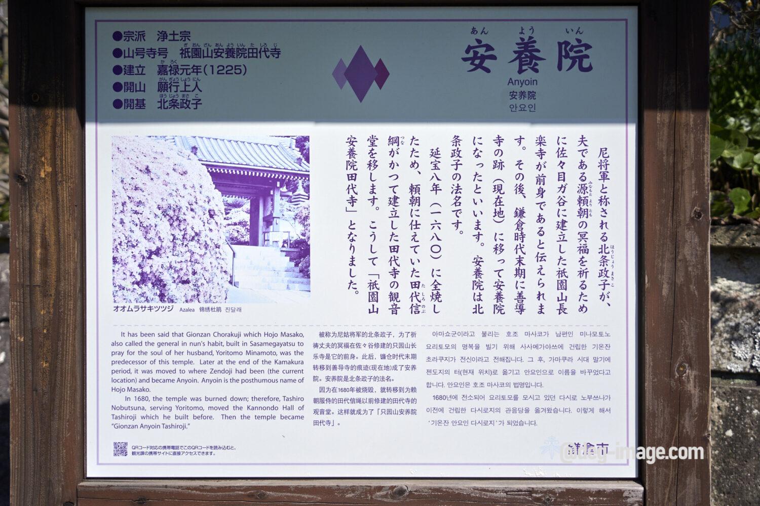 安養院は北条政子の法名にちなむ浄土宗の寺です。4月終わりから5月はじめにかけて境内はツツジの色に染まり、ツツジ寺と呼ばれています。