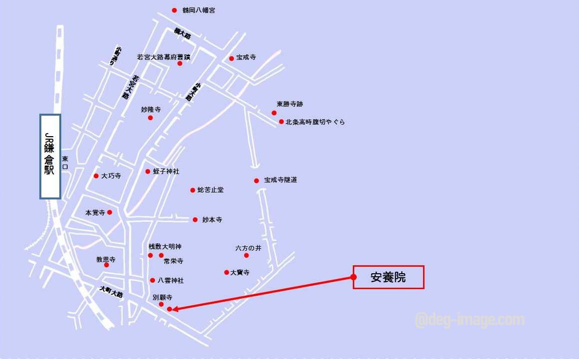 鎌倉駅から安養院までは、若宮大路を南下しJR線横須賀線と交差するところから大町大路を東に進む道と、小町大路を南下し大町大路との交差点から大町大路を東に進む二つの道があります。
