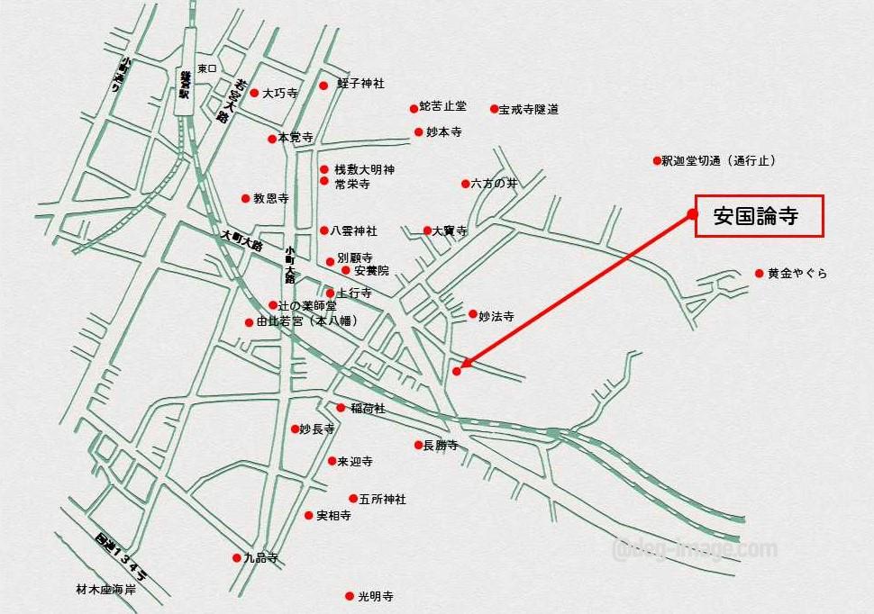 鎌倉駅東口から緑ヶ丘方面(鎌31系統 緑ヶ丘入口行き)バスに乗って、名越バス停で下車、降りましたらバスが来た道を今度は15mほど戻ります。すると大町大路と妙法寺道分岐点に安国論寺の案内がありますので、その角を右に戻る形で入ります。そのまま100mほど直進します。四角の左前に額田記念病院が見えましたら、その角右手に安国論寺があります。