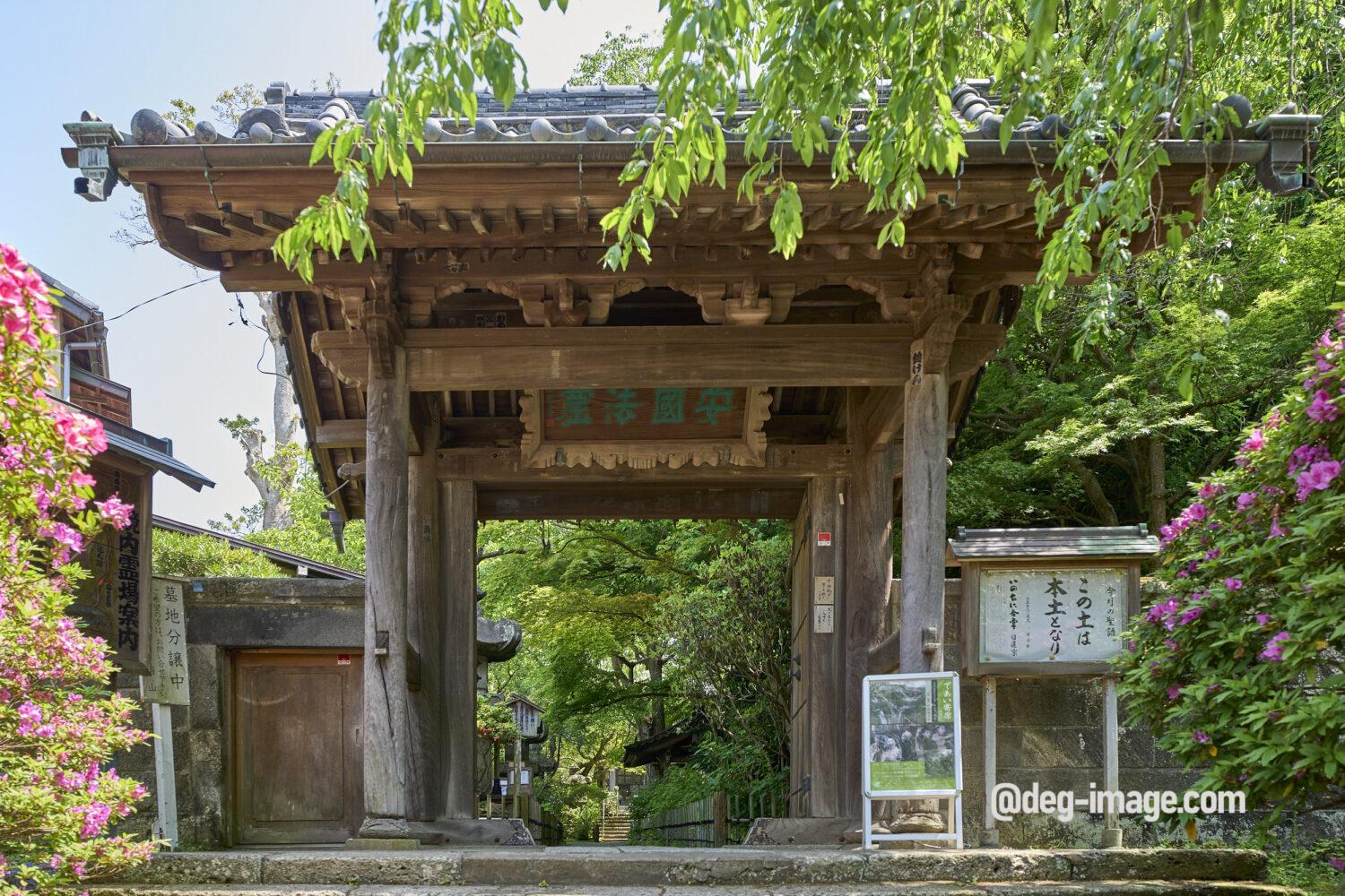 鎌倉駅東口から緑ヶ丘方面(鎌31系統 緑ヶ丘入口行き)バスに乗って、名越バス停で下車、バスが来た道を10mほど戻ると川の手前に右に伸びる細い路地があります。その路地を曲がり大町四丁目自治会掲示板のところを右に(方向的にはバス停の方向に戻る形)曲がり150mほど進むと安国論寺の山門が見えてきます。
