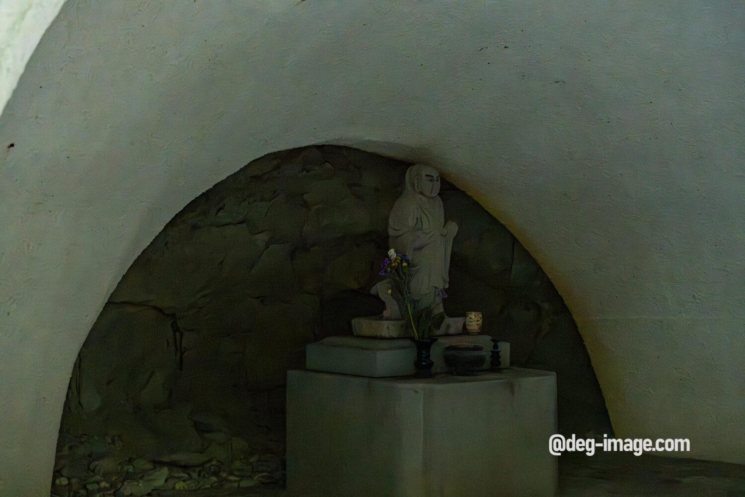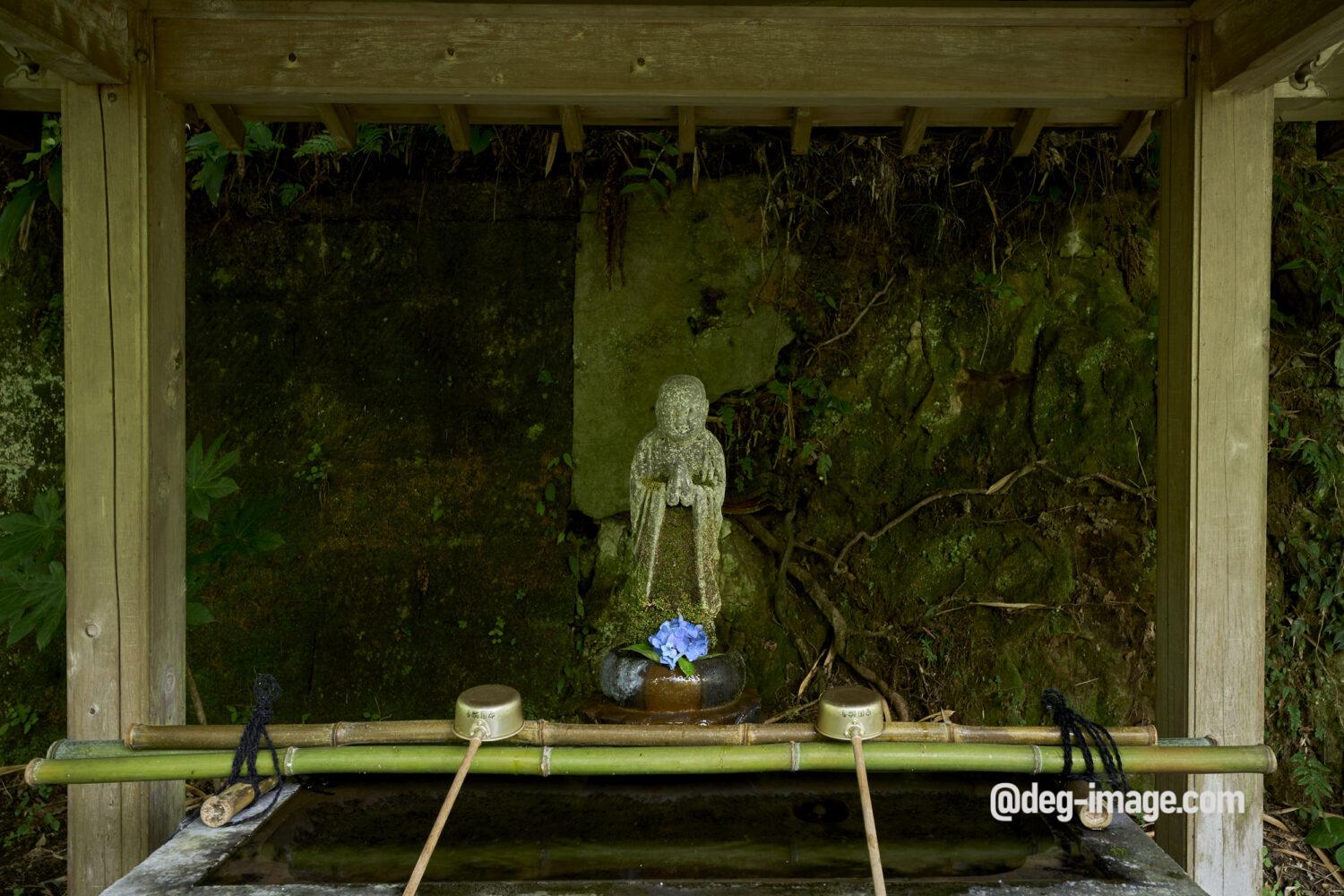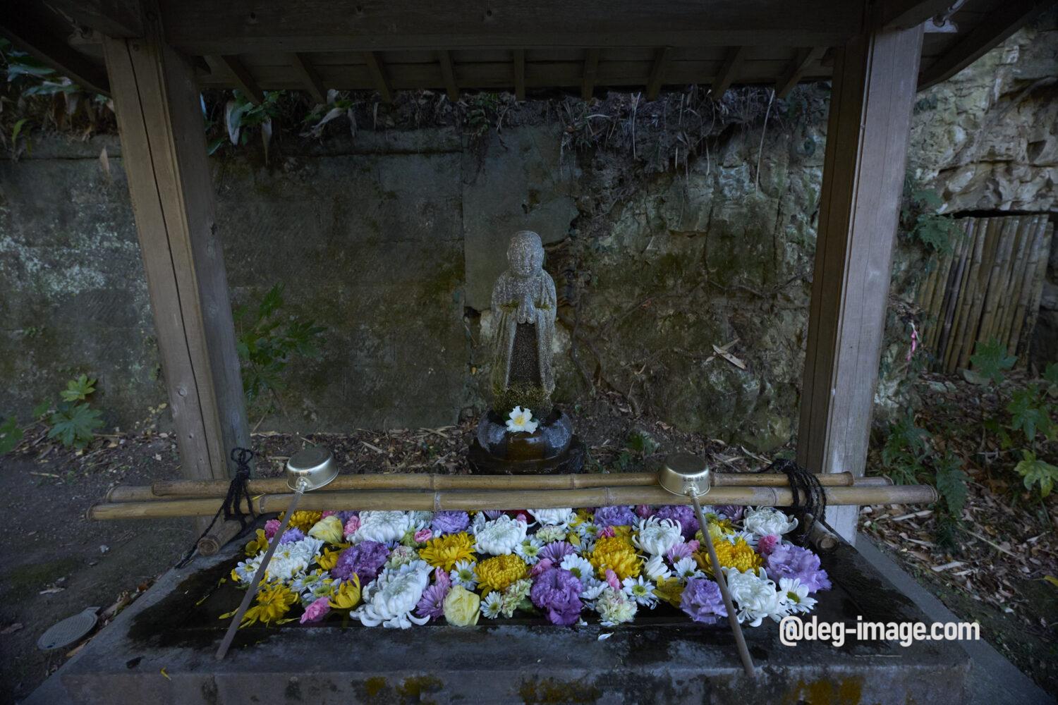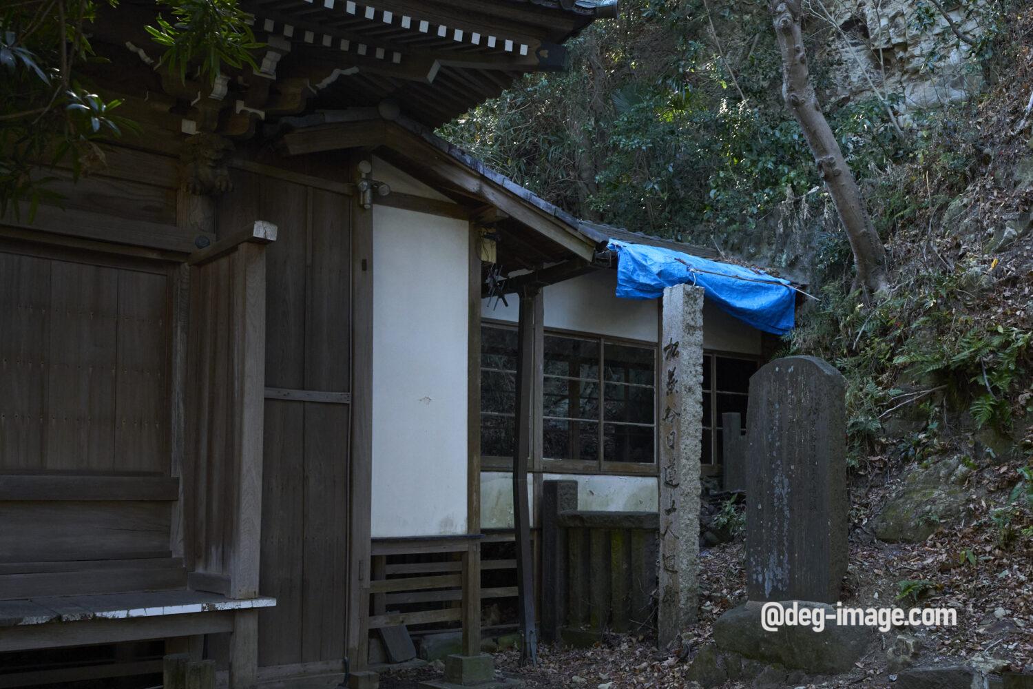 日蓮聖人が硯水を汲んだ井戸とされるのが「御硯水」といいます。その右手の洞窟は「化生窟」といい、日蓮聖人が鎌倉で布教を始めた際に、最初の一晩を過ごした場所と伝わります。このニ箇所は境内の北側の飛び地にあります。