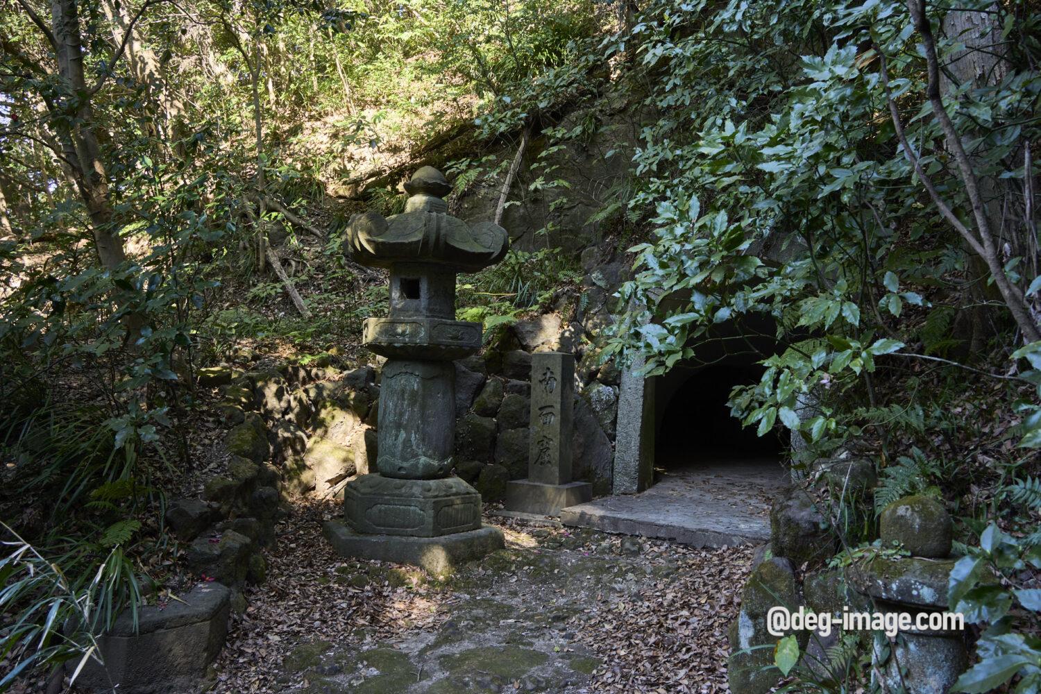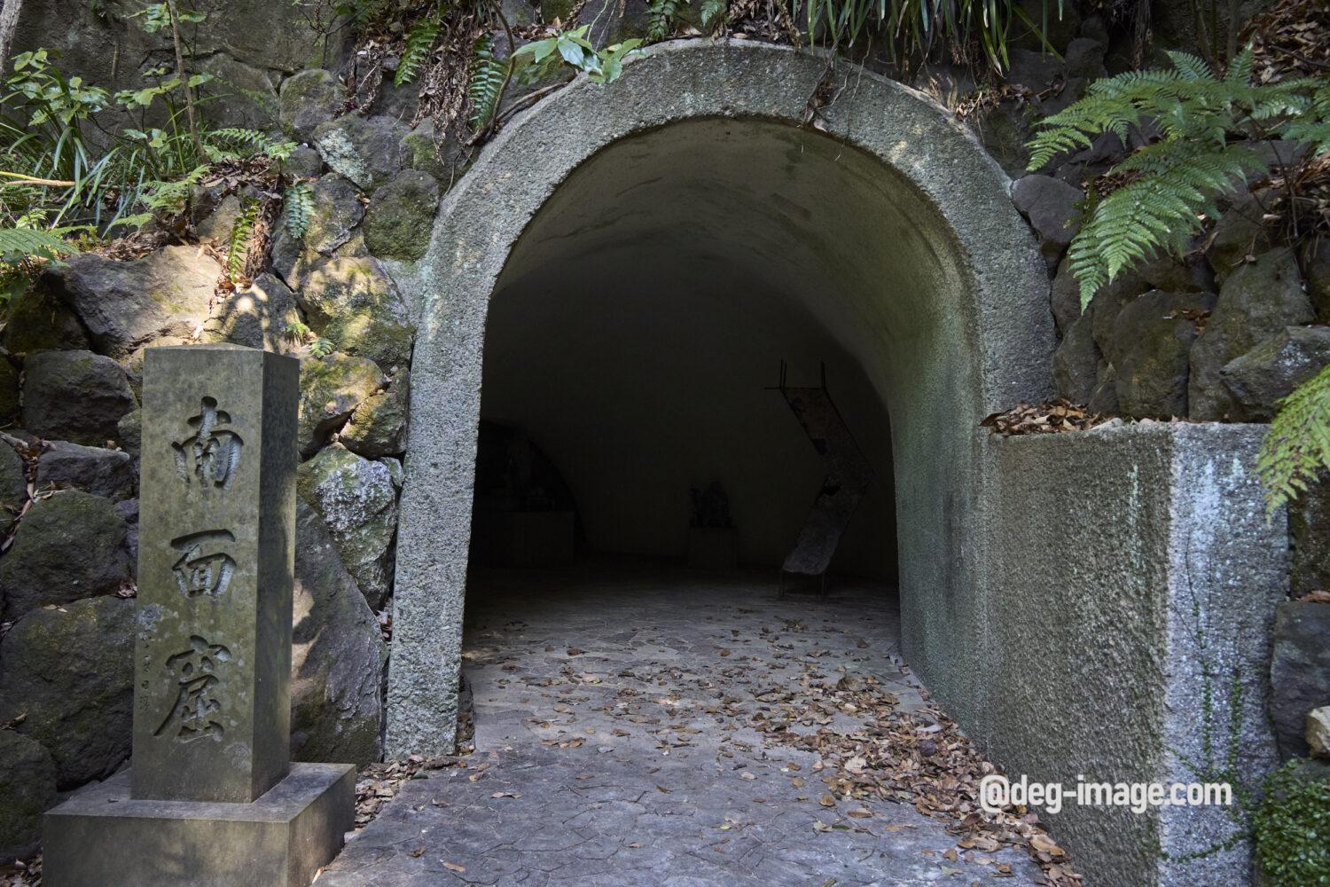 松葉ヶ谷法難では、焼き討ちの際日蓮聖人は白猿に導かれ難を逃れたと言い伝えられており、その避難先と伝わるのが南面窟です。祖師堂の右手、山の中腹にあります。