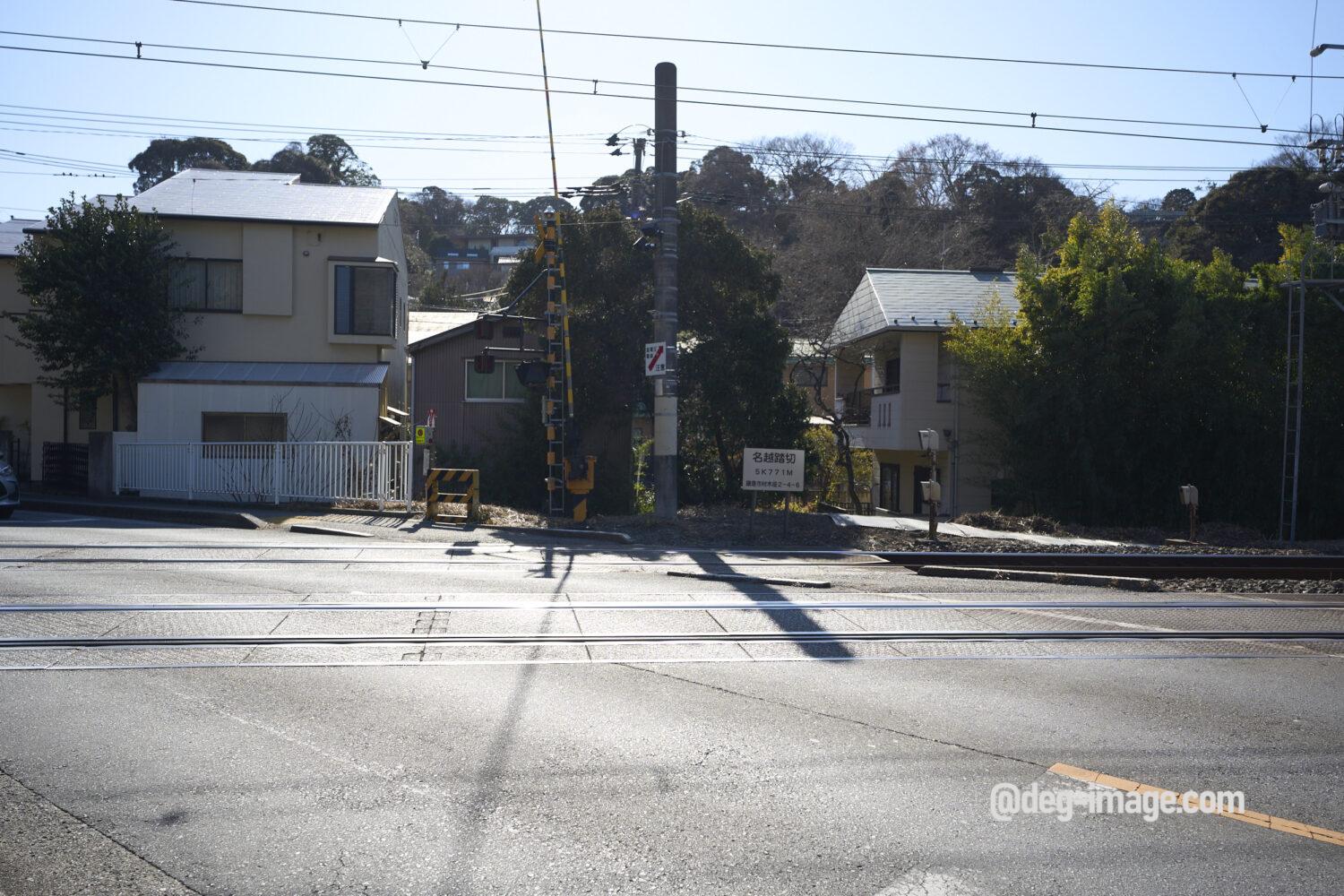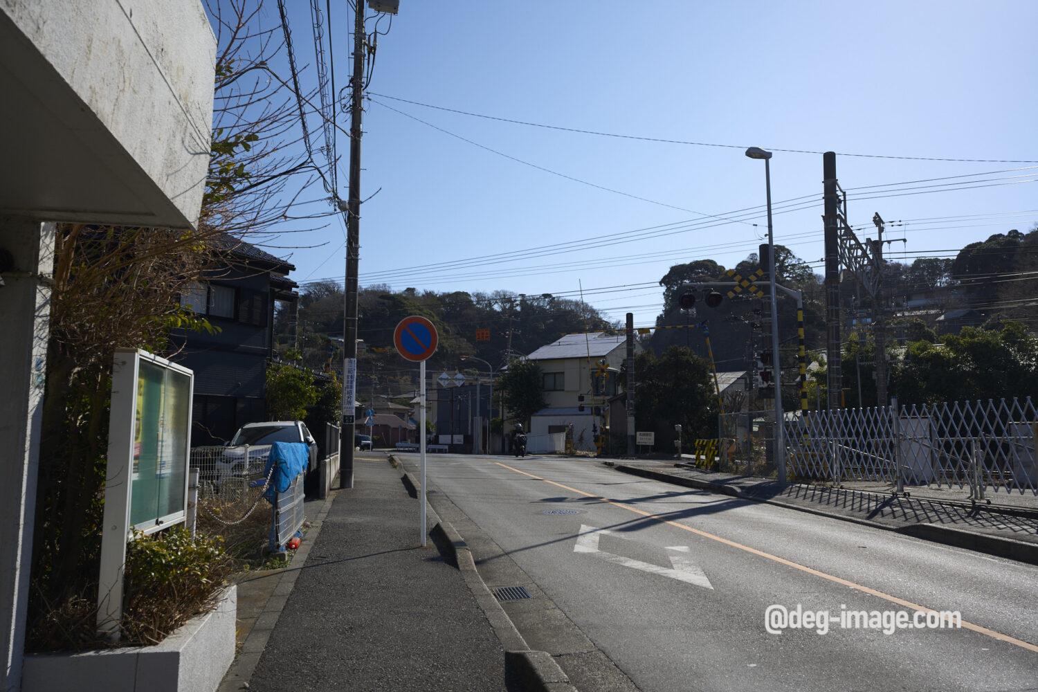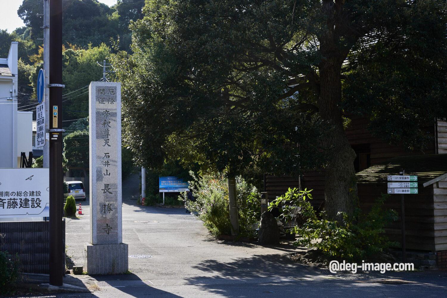 大町大路に出てからは、別願寺を通り越して真っすぐ進み、ローソン先の信号のある交差点を直進すると、安国論寺の案内のある三叉路に出ますので右方向の大きな道を進みます。名越バス停を超え200mほど進むと左手に交番があり、その先に名越の踏切があります。名越の踏切をわたると道路の案内に長勝寺を右方向道路に示したものがありますが、踏切先では右にに折れる道路を進ます、大きな道の少し先にある横断歩道をわたり、大きな道に沿って少し進むと鎌倉駅方向の長勝寺バス停が見えその手前に長勝寺寺標があります。