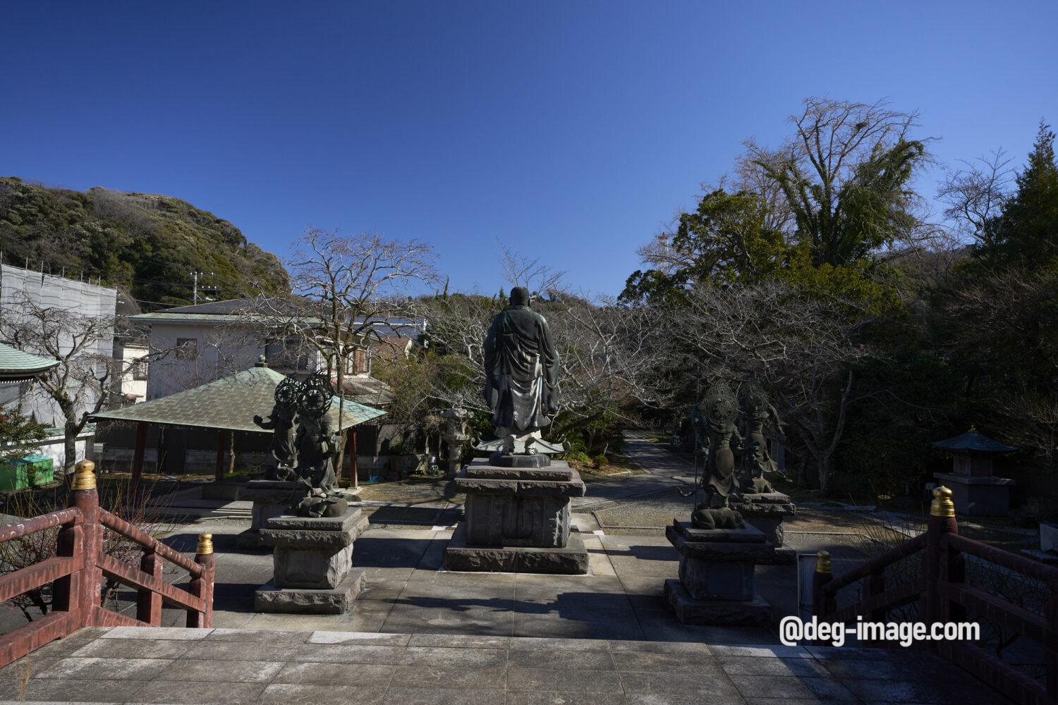 前の広場には、高村行雲作の日蓮聖人の銅像が立っており、周りに持国天、増長天、広目天、毘沙門天の四天王像が立っています。