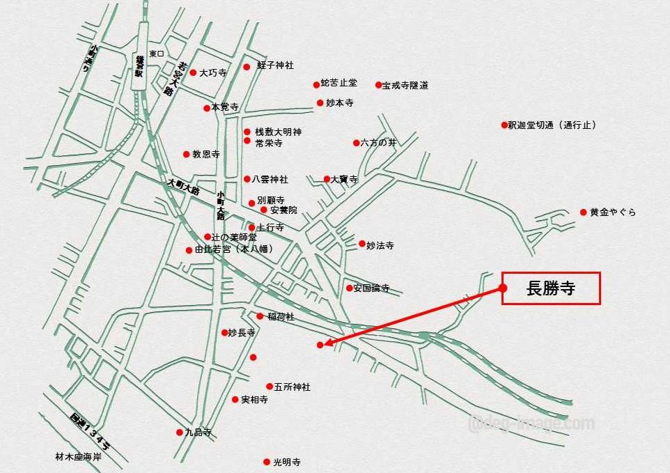 JR鎌倉駅東口3番バス乗り場から緑ヶ丘入口行きで「長勝寺」下車徒歩1分