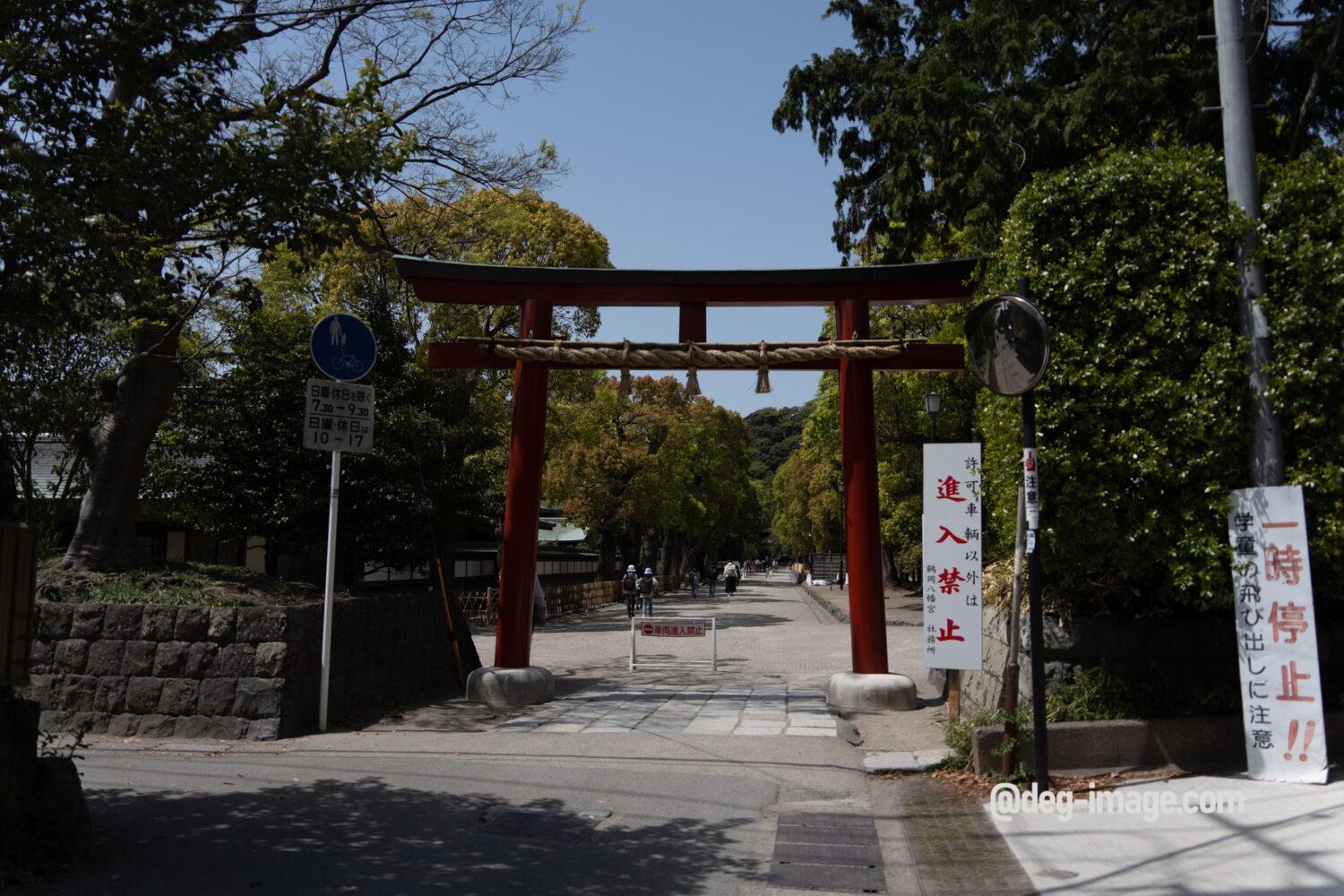 鶴岡八幡宮東門には若宮大路に面した三の鳥居に比べると小ぶりな鳥居が建ち、参拝者の数も少なめで落ち着いた雰囲気です。
