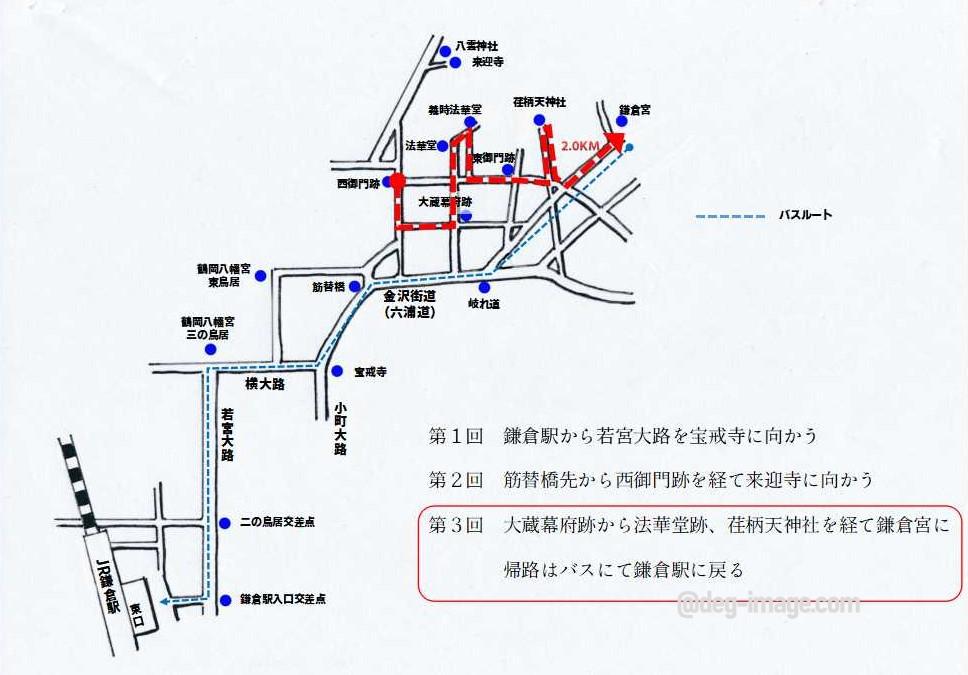 今回の全体的な行程は、徒歩でJR鎌倉駅を出発し、宝戒寺・来迎寺を参拝、
