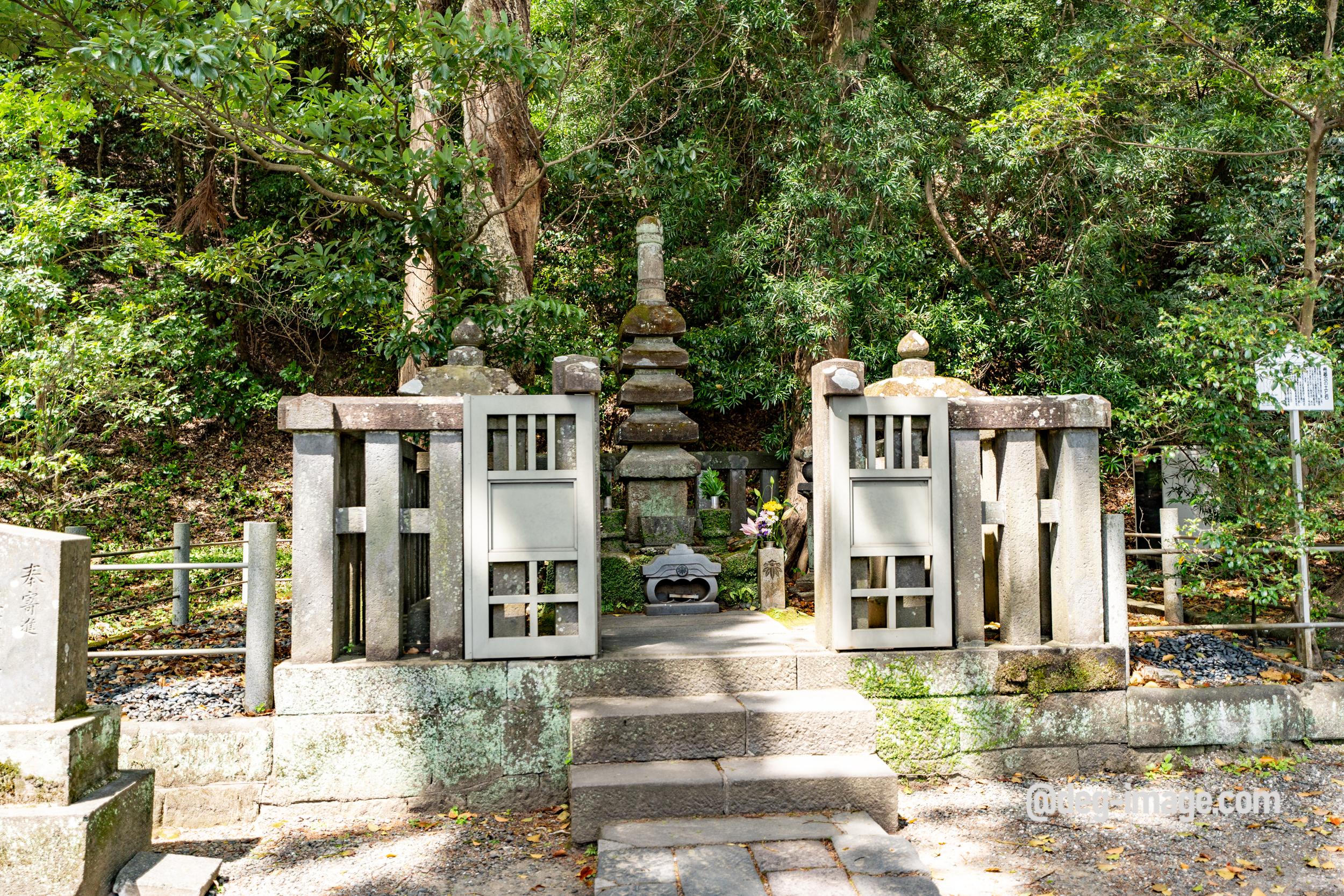 三人の墓。手前の島津忠久の墓とあとの二人の墓との間に仕切りがあり、それぞれの階段を使わないとお参りできません。
