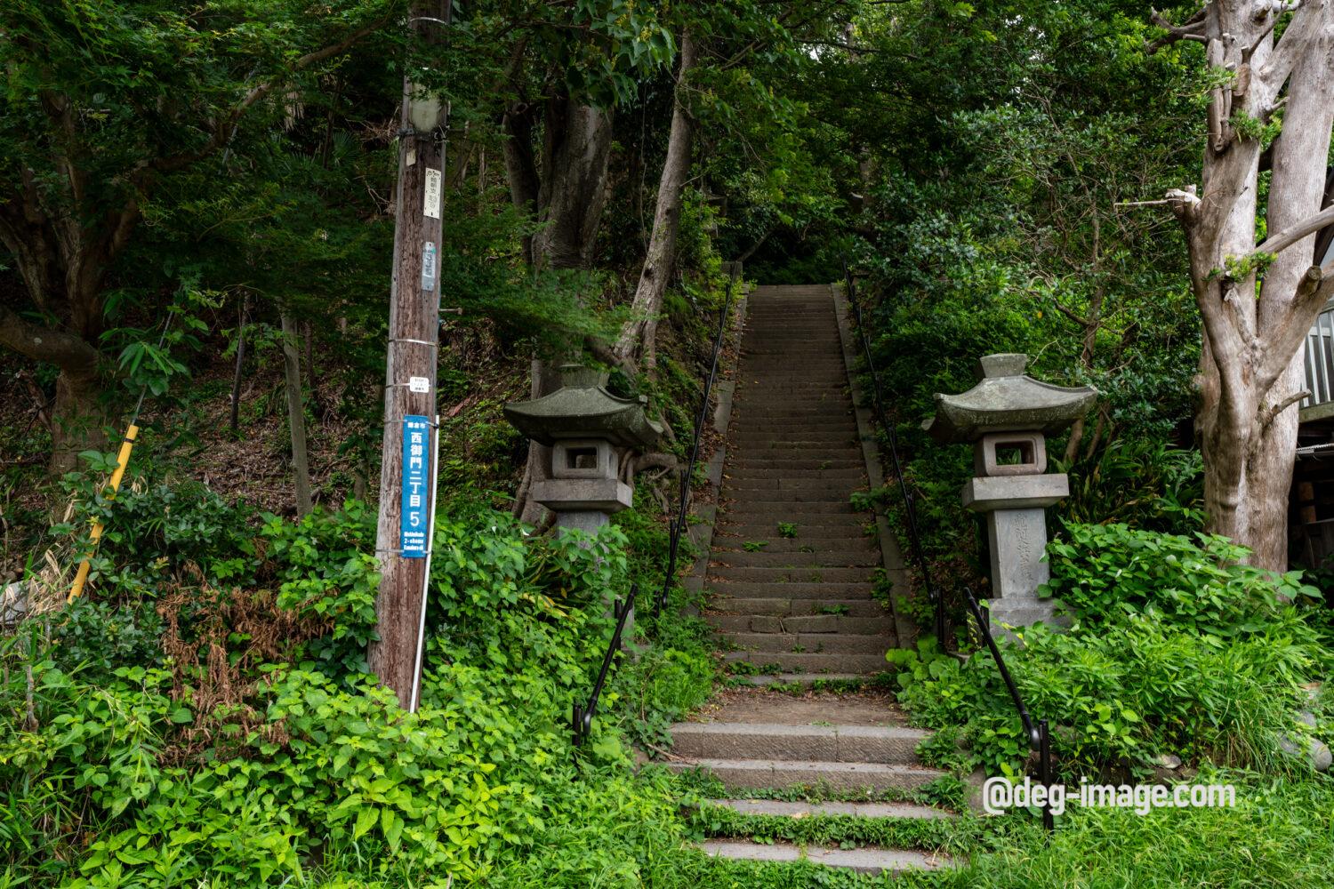 鳥居からは山の中腹にある本殿に向かって参道が伸びています。周辺は閑静な住宅街、訪れる人も多くはない。