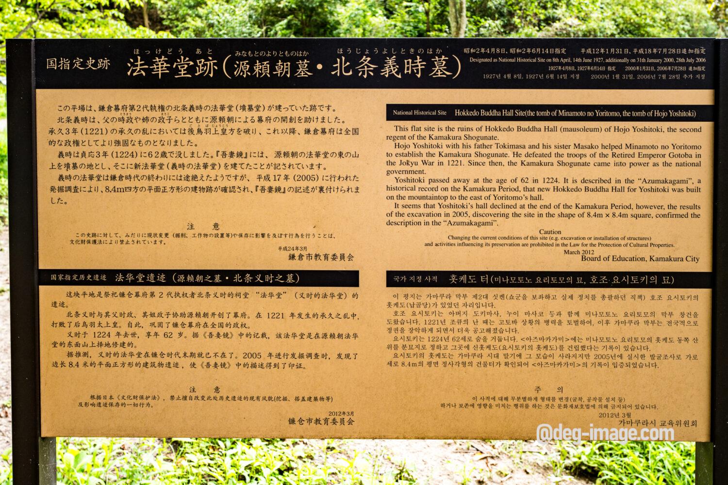 山の中腹に開けた場所があり、義時の法華堂跡の案内があります。