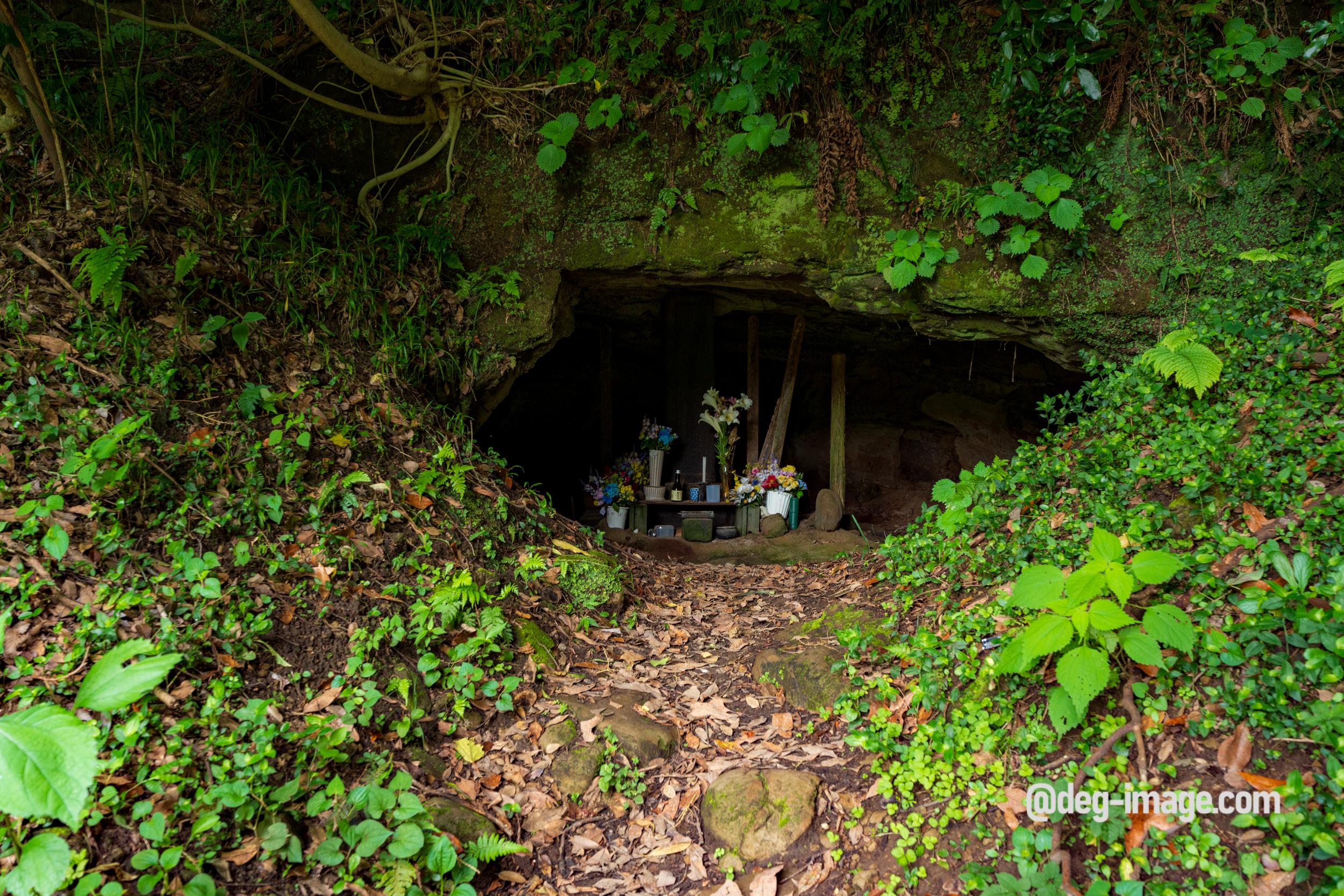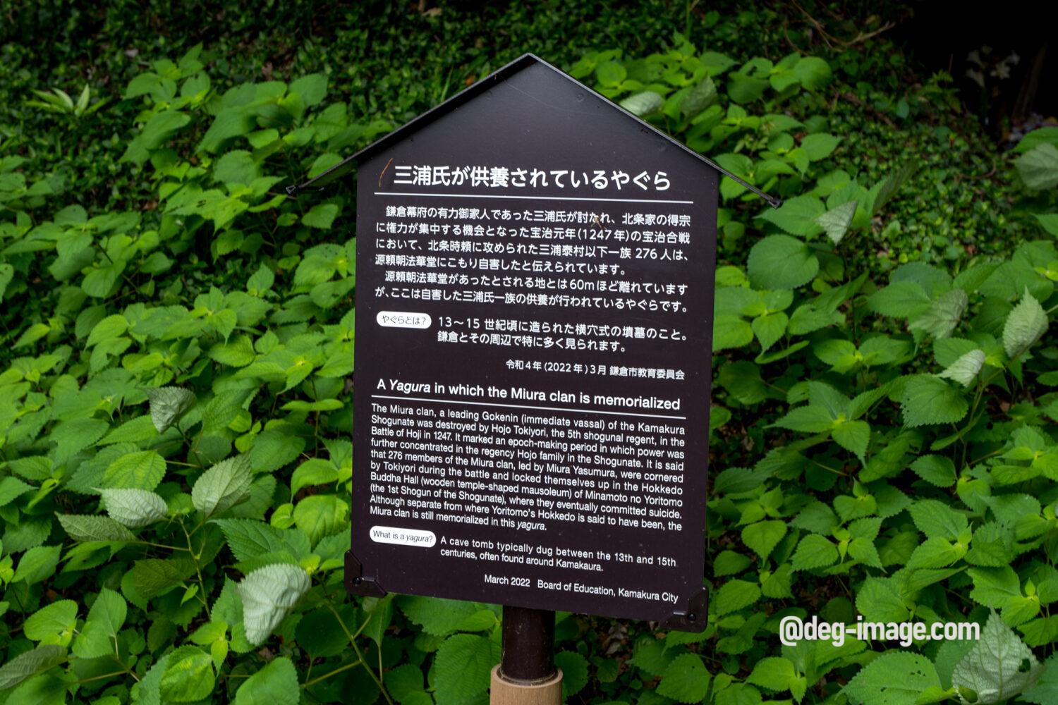 鳥居左側にある三浦氏が供養されているやぐら(横穴状の墓)には、鎌倉幕府の有力な御家人であった三浦氏一族が供養されていると伝えられています。三浦一族は、北条家に鎌倉幕府の権力が集中する機会となった宝治元年(1247年)の宝治合戦で、第五代執権北条時頼に攻められ、一族が頼朝法華堂にこもり自害をしたといいます。
