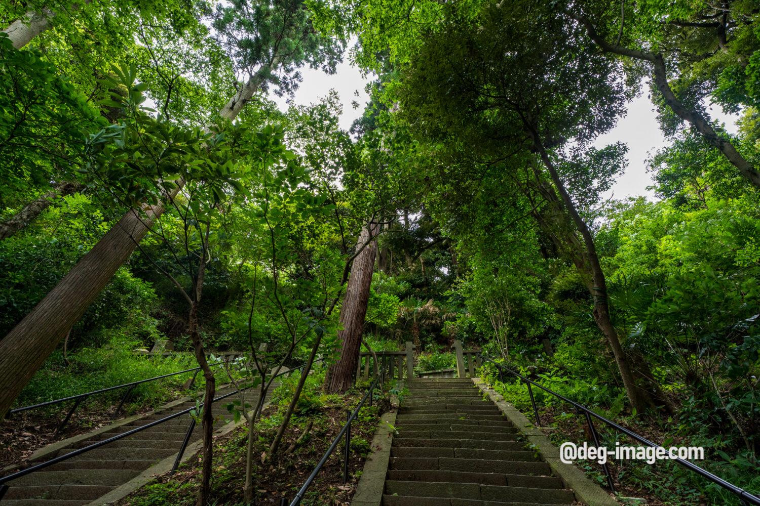 義時の法華堂跡と大江広元らの墓の入り口にある階段。木々が鬱蒼と生い茂っています。